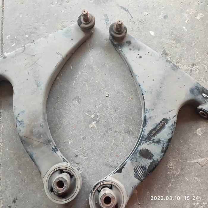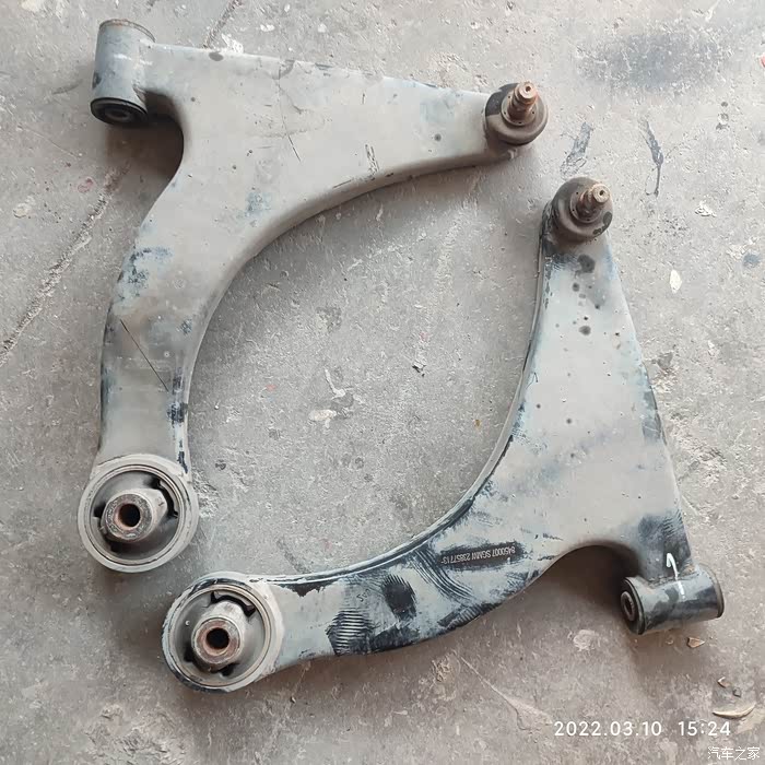 这是拆下来原车的下摆臂总成,新买来的下摆臂总成是广西鸣新底盘(原万向钱潮)工艺细节不一样,说什么配套五菱的我看不像,不知道能用多久!