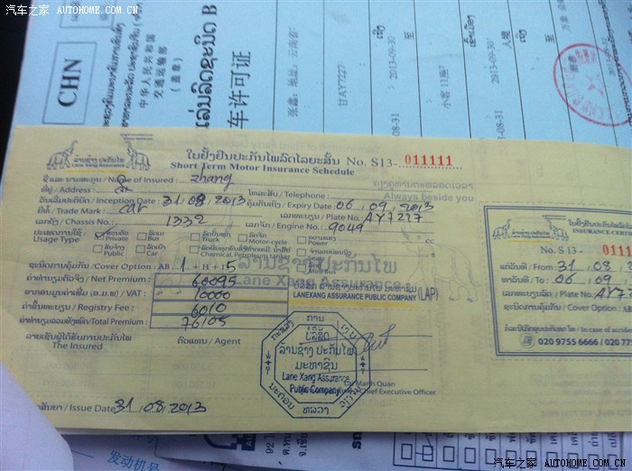 该交的钱都交了,该办的手续却差一个,虽然我们都已经过了关,却还差保险没有买,一直听说老挝警察查到你未买保险会重罚的传闻,但是我们都已经开车过了海关却还没有人提示我们买保险,我们在关口问了几个人都说下班了。亭子里确实也没有人。。时间慢慢的过去了,我们一狠心一跺脚,决定先走,遇到警察查车罚款再说吧。。刚走了十来米,就发现路的右手有2个办理保险的房子,其中一间还在上班,靠,原来过关了还可以买到保险啊。。好吧,里面的老挝人非常热情,给我们每个人都让座,搬凳子等。我们同样买了7天的保险,却只有5.6万元,比第一天刚进老挝的7天9.6万便宜很多,不知道为什么。。总之保险买了,心也安了,传说中的消毒估计也下班了,总之没有看到。