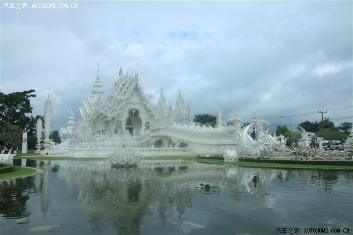 清莱白庙纯白的屋顶,纯白的墙壁,纯白的基座,镶嵌在墙面的玻璃时不时反射出耀眼的银光,仿佛一座落入凡间的琼楼玉宇。