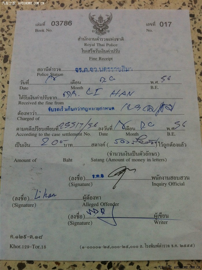 果真是超速了啊,前往边境口岸的路是限速的,90KM/H,我们跑到了123km/h,泰国警察现场办公,开具了200B的罚款单,合人民币40元不到。想想出发当天,在陕西安康高速跑了93,处罚100元扣3分, 我心里顿时不平衡了。
