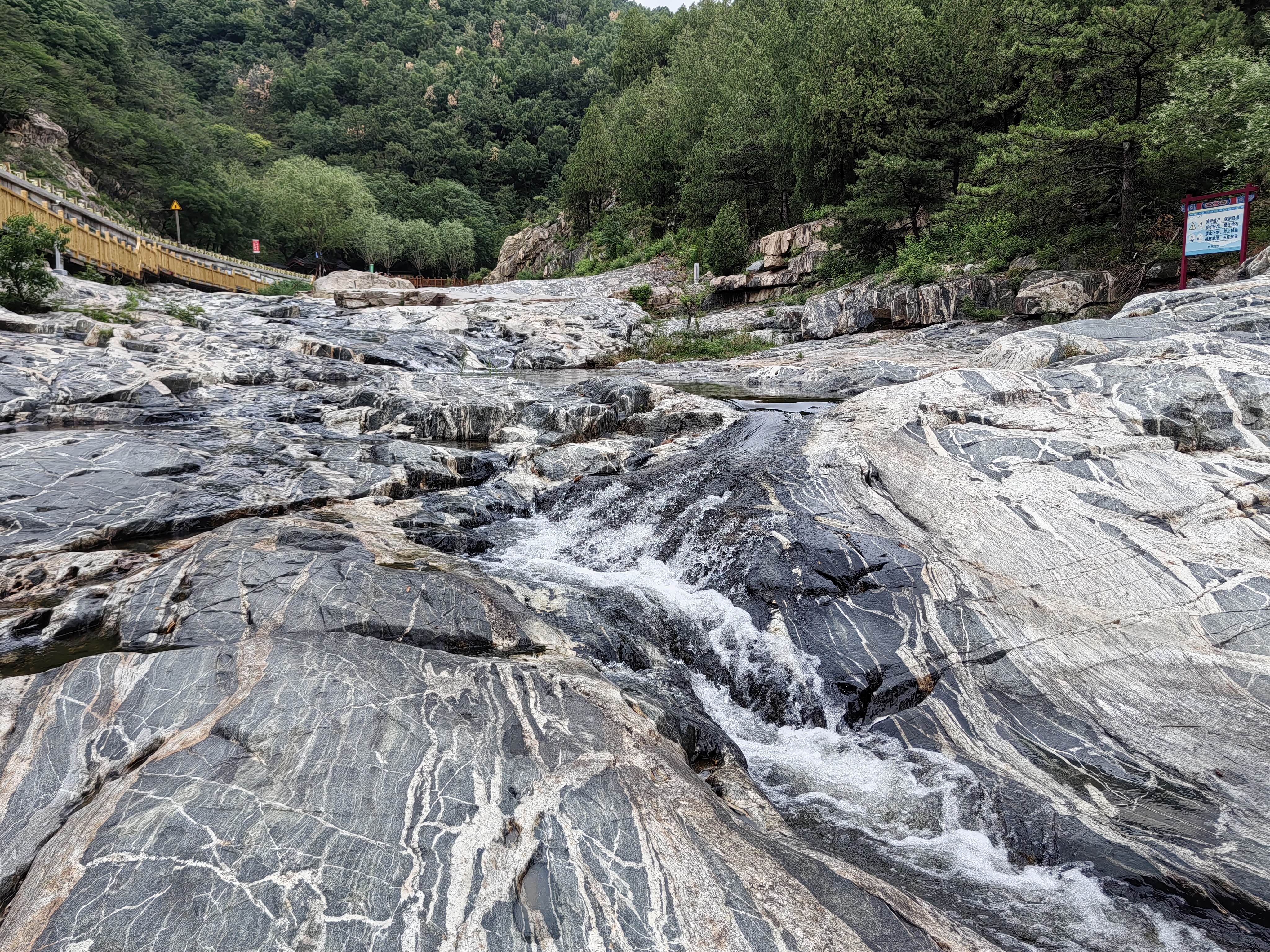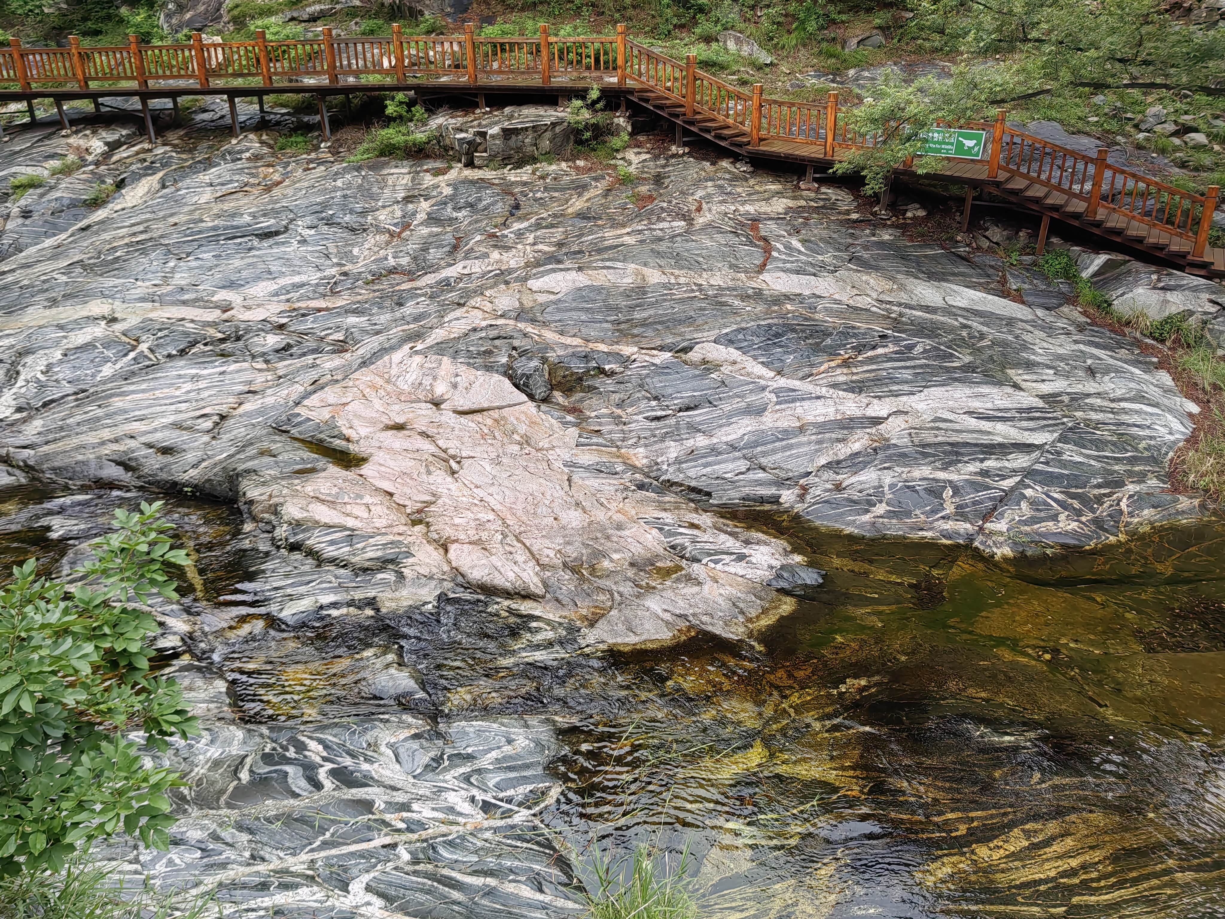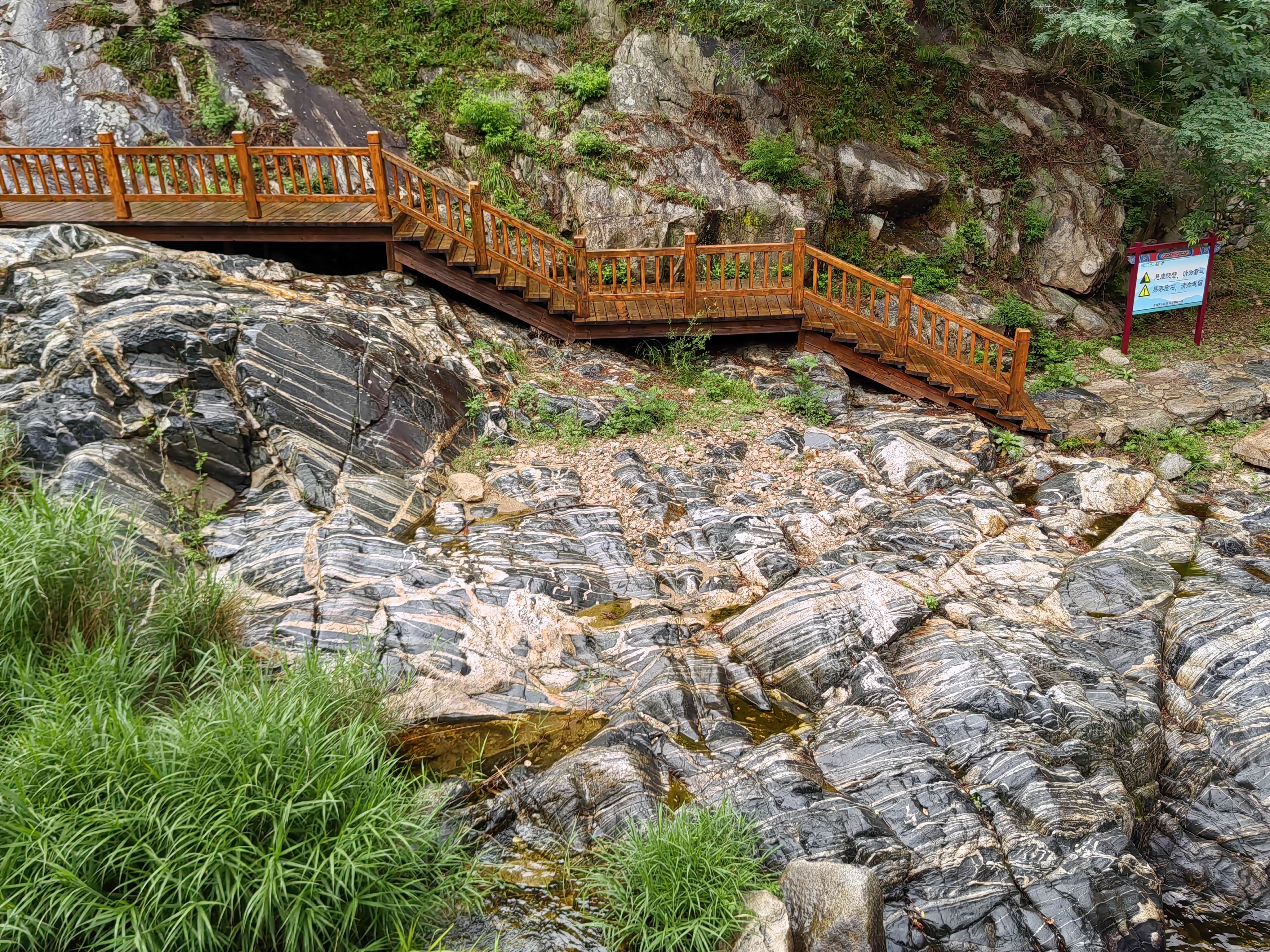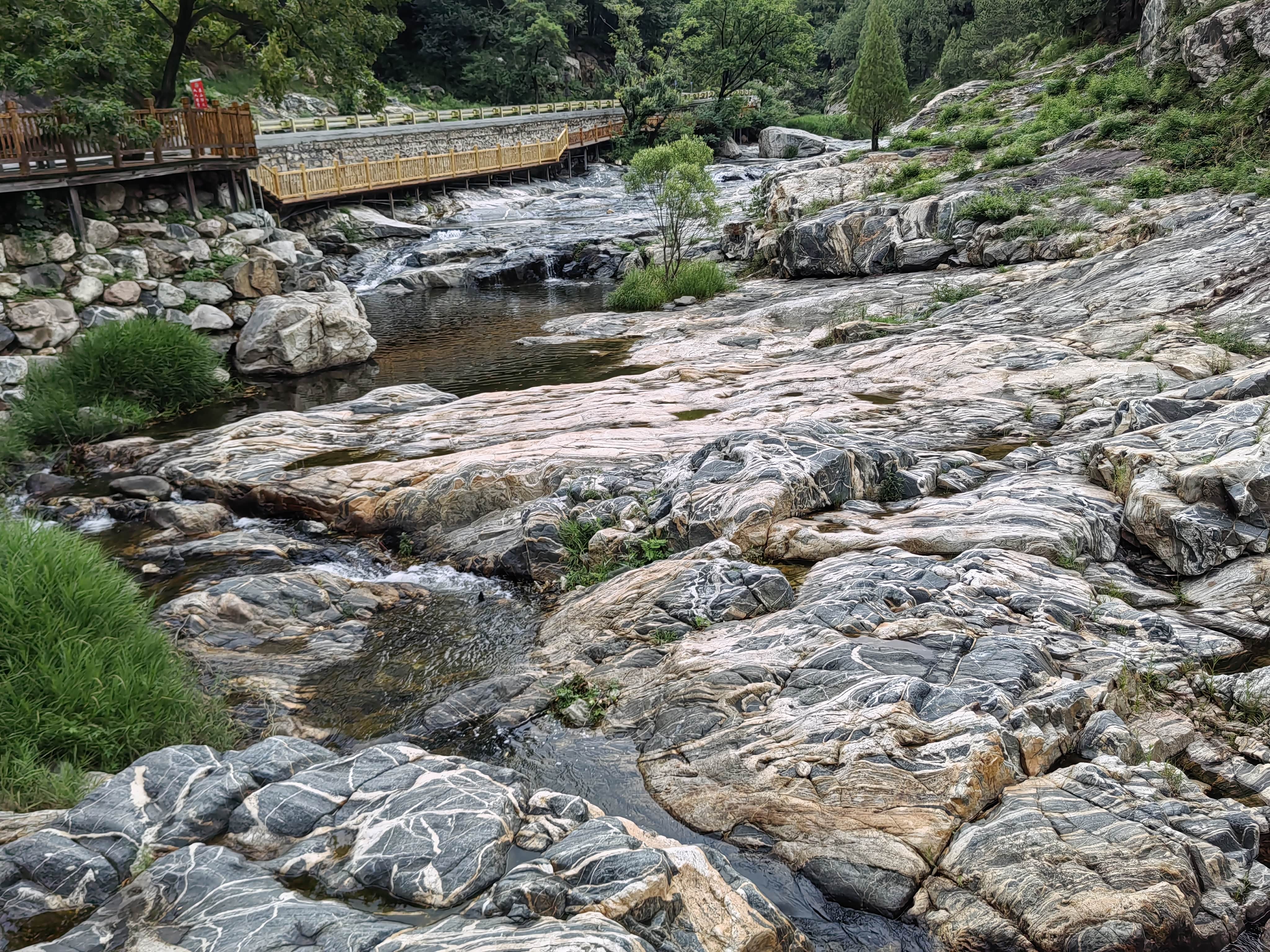 溪边的木栈道,不知为何被封住不让进了。河床里的带花纹的石头就是有名的泰山石。