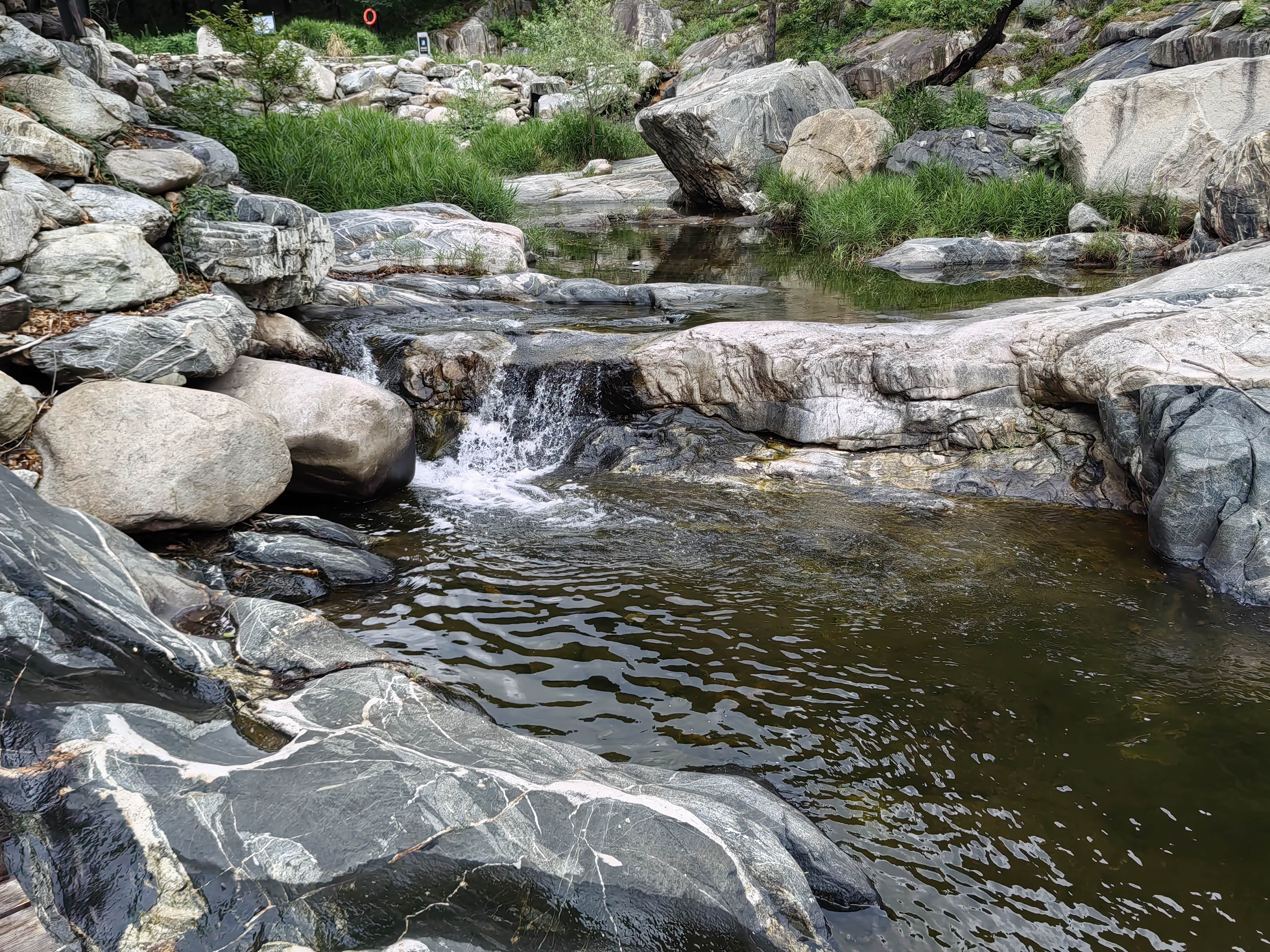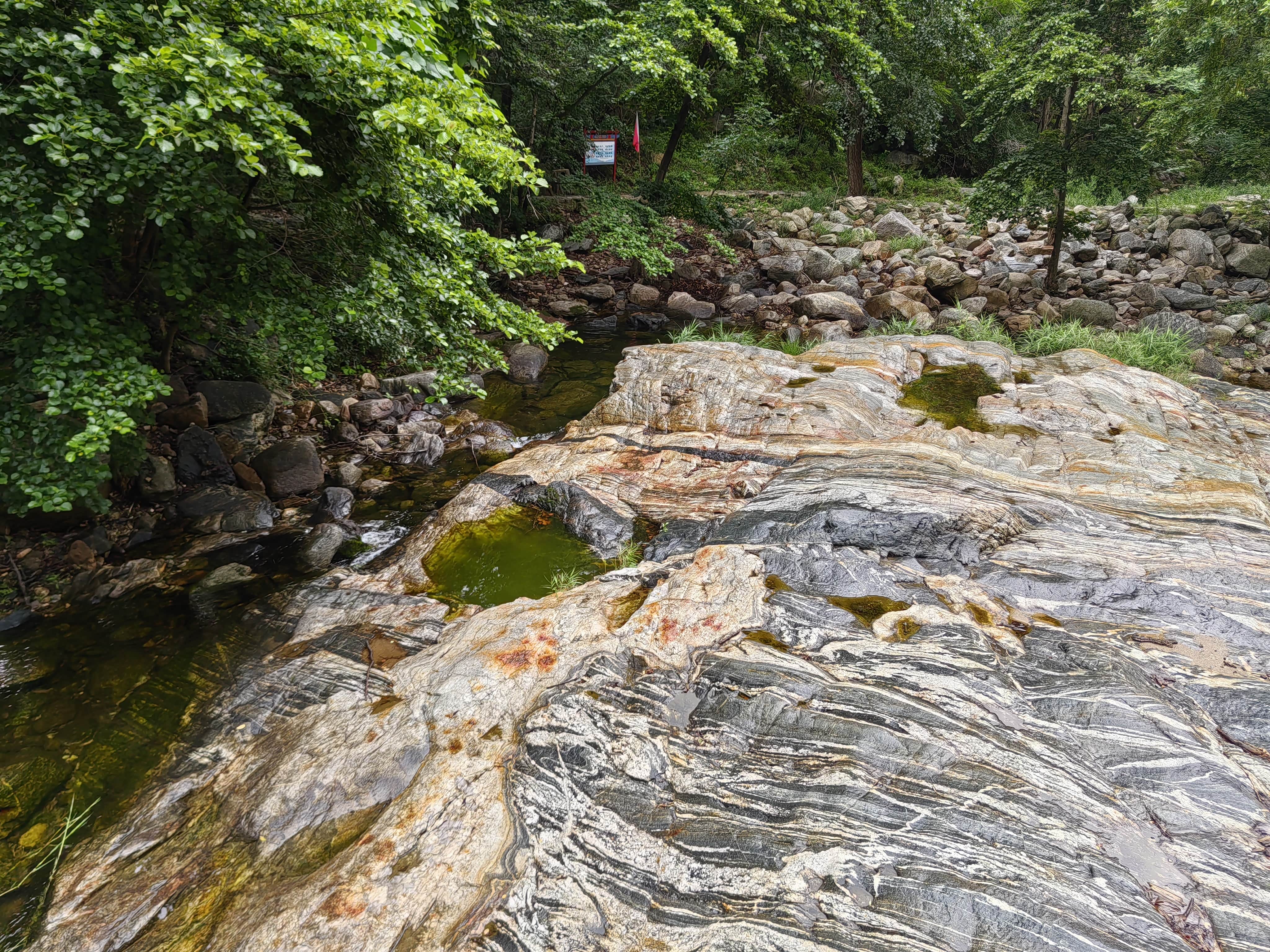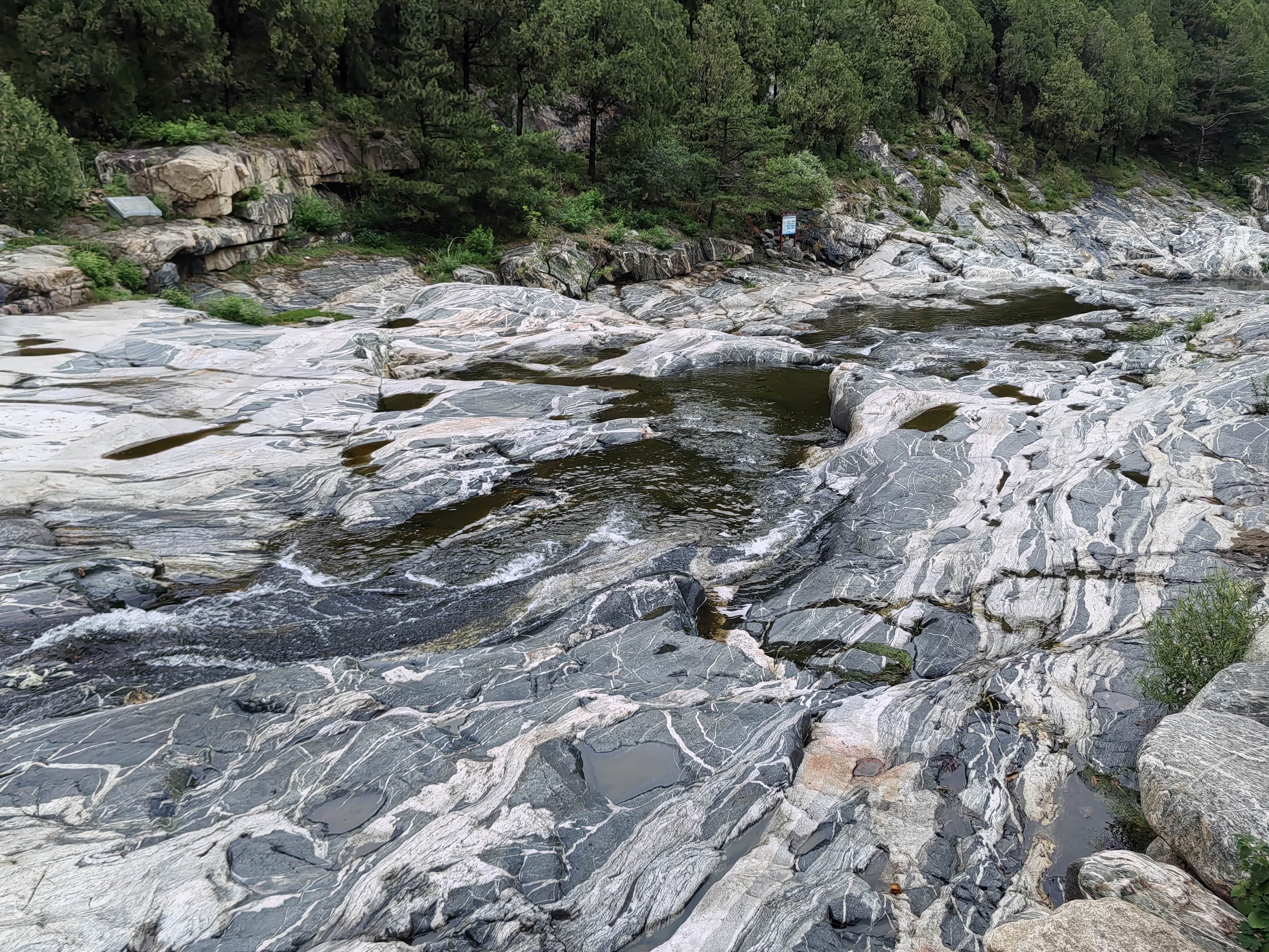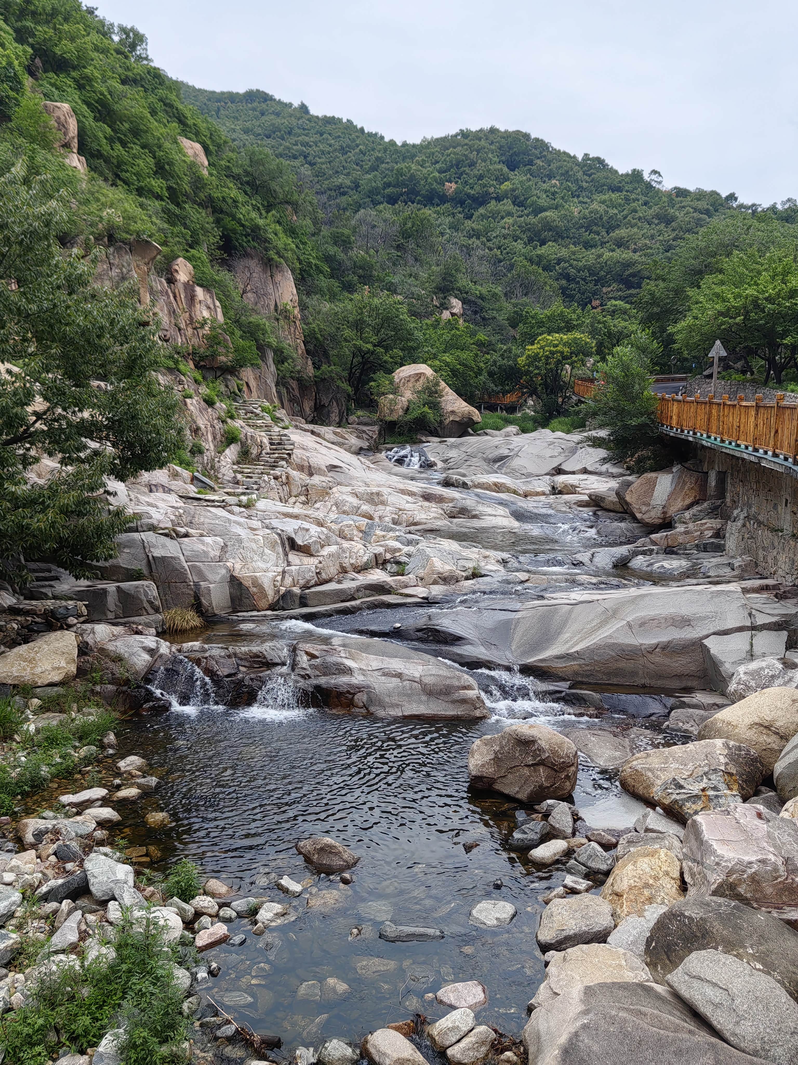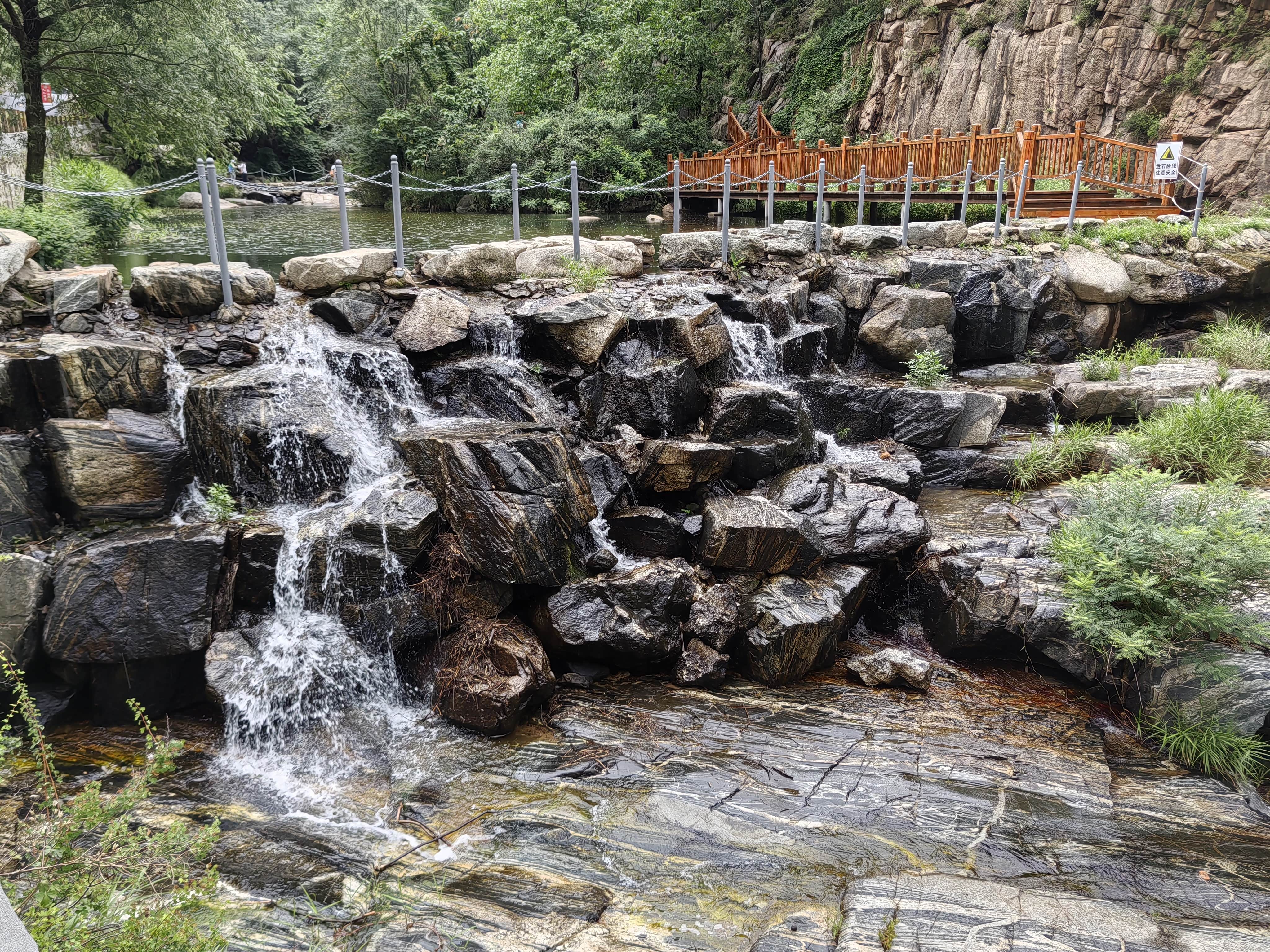 溪边的木栈道,不知为何被封住不让进了。河床里的带花纹的石头就是有名的泰山石。