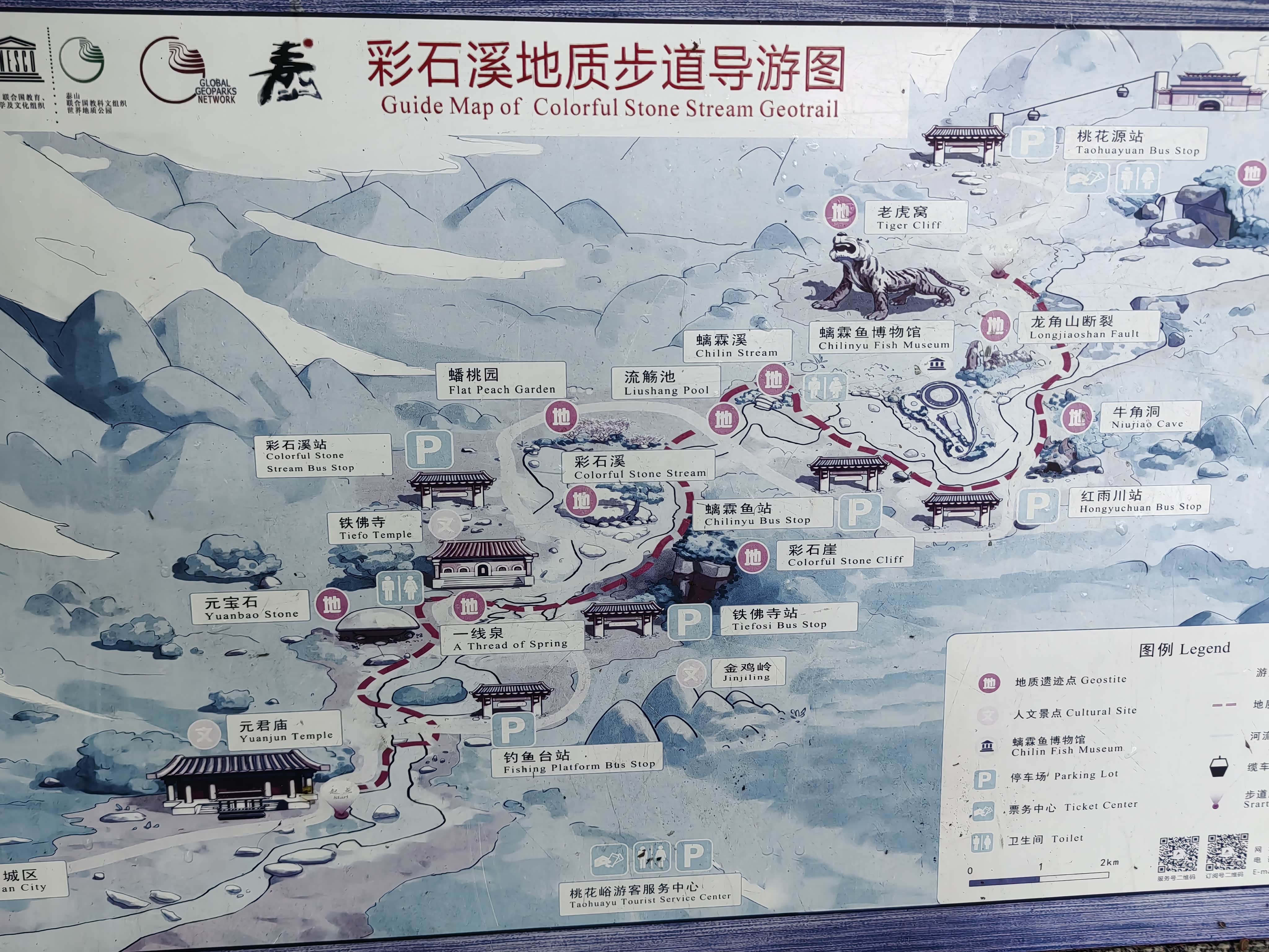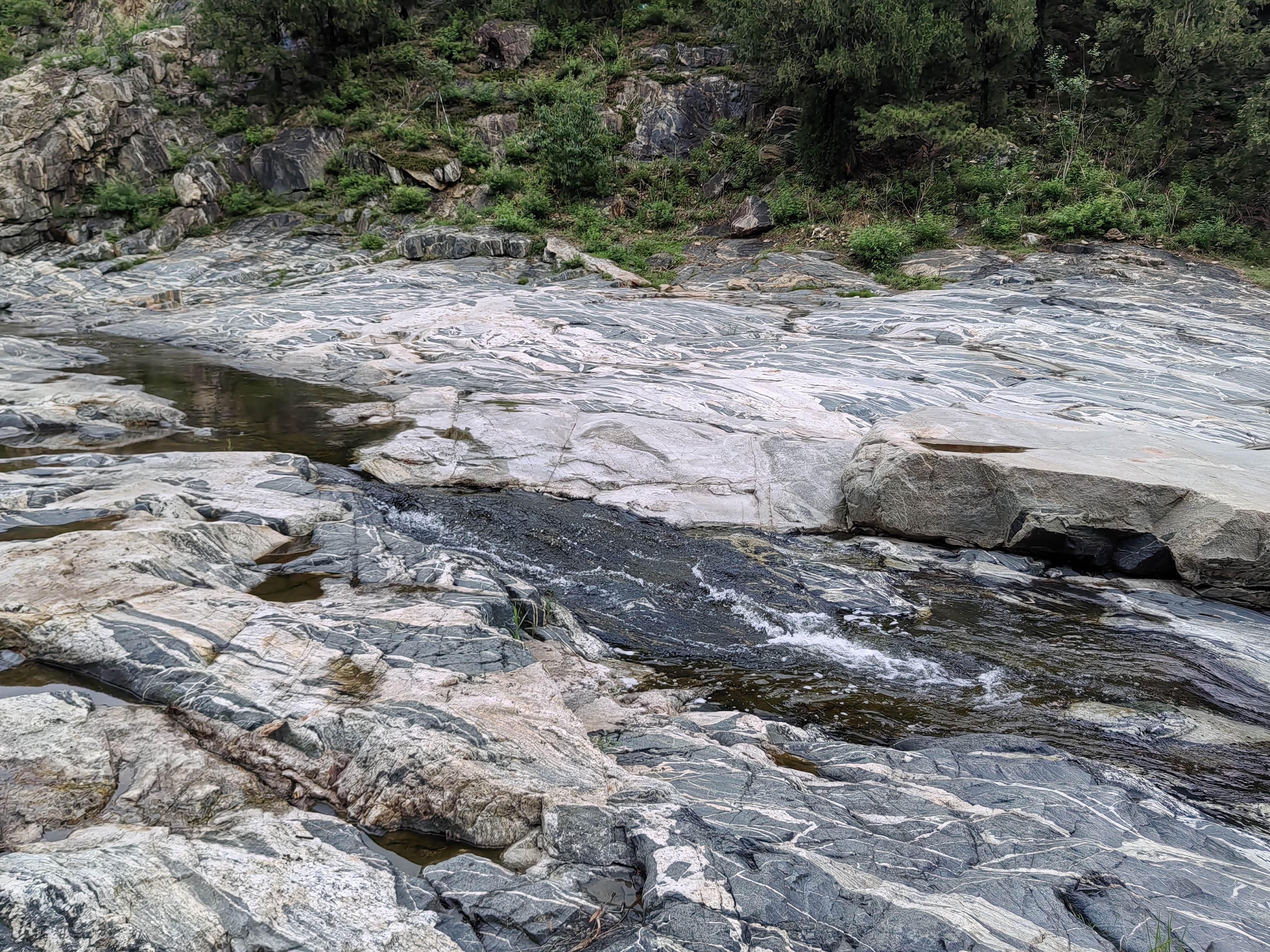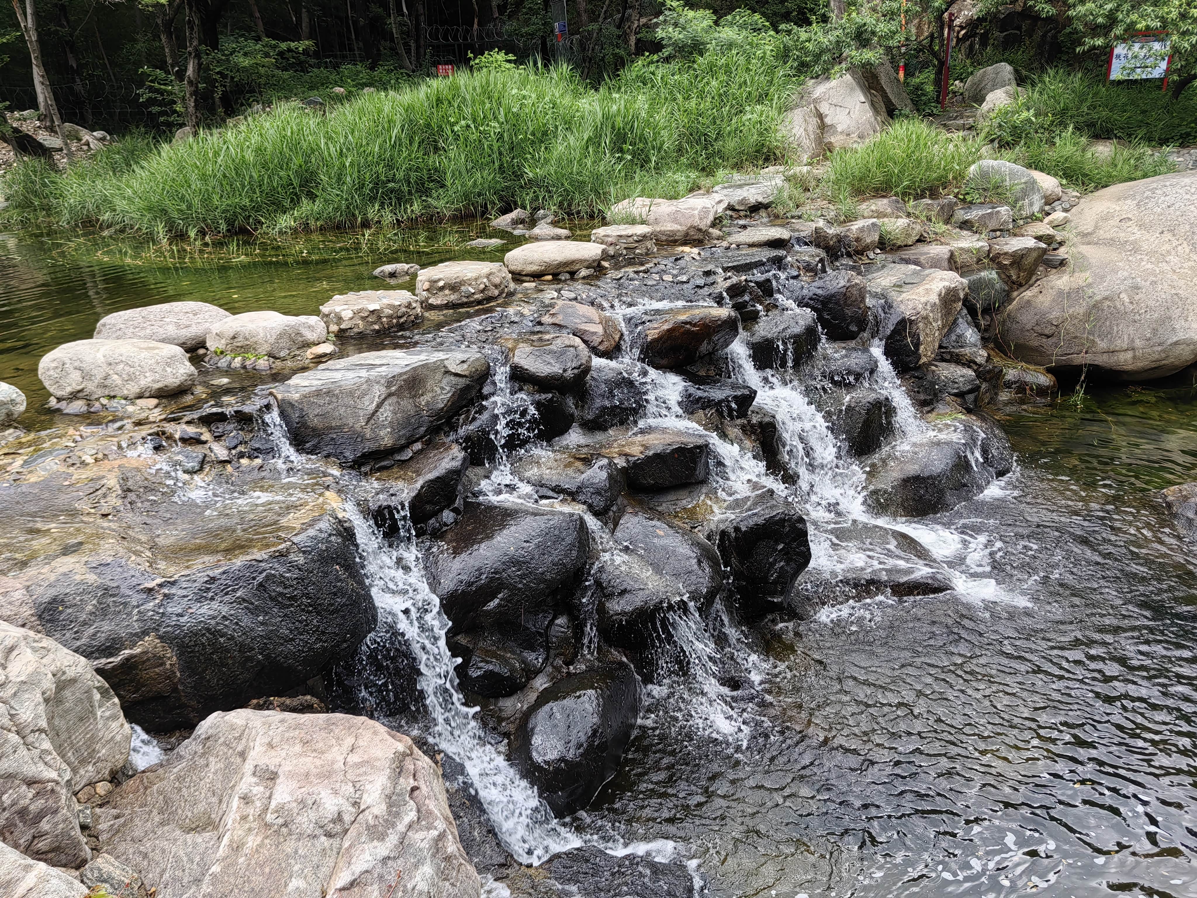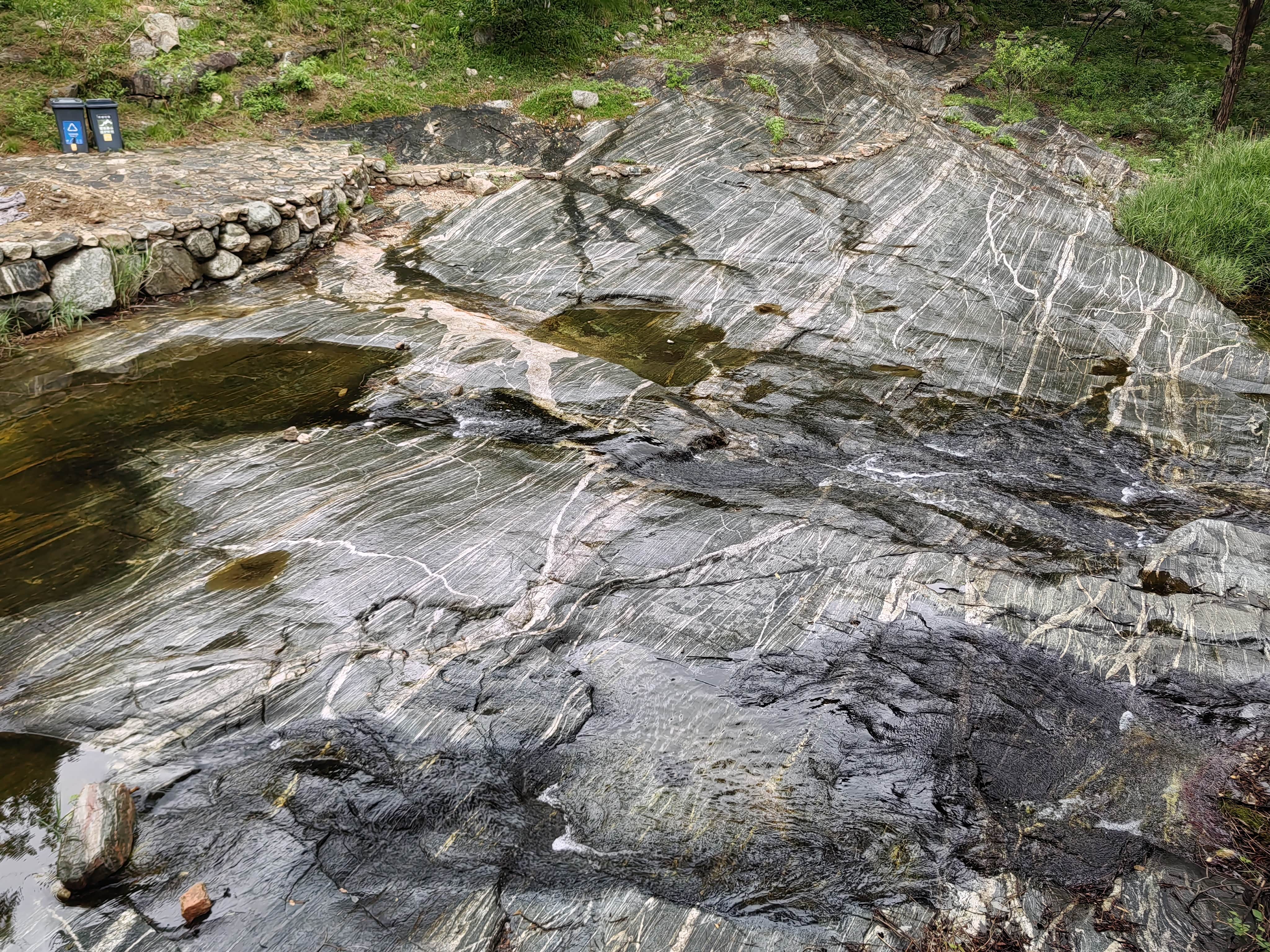 溪边的木栈道,不知为何被封住不让进了。河床里的带花纹的石头就是有名的泰山石。
