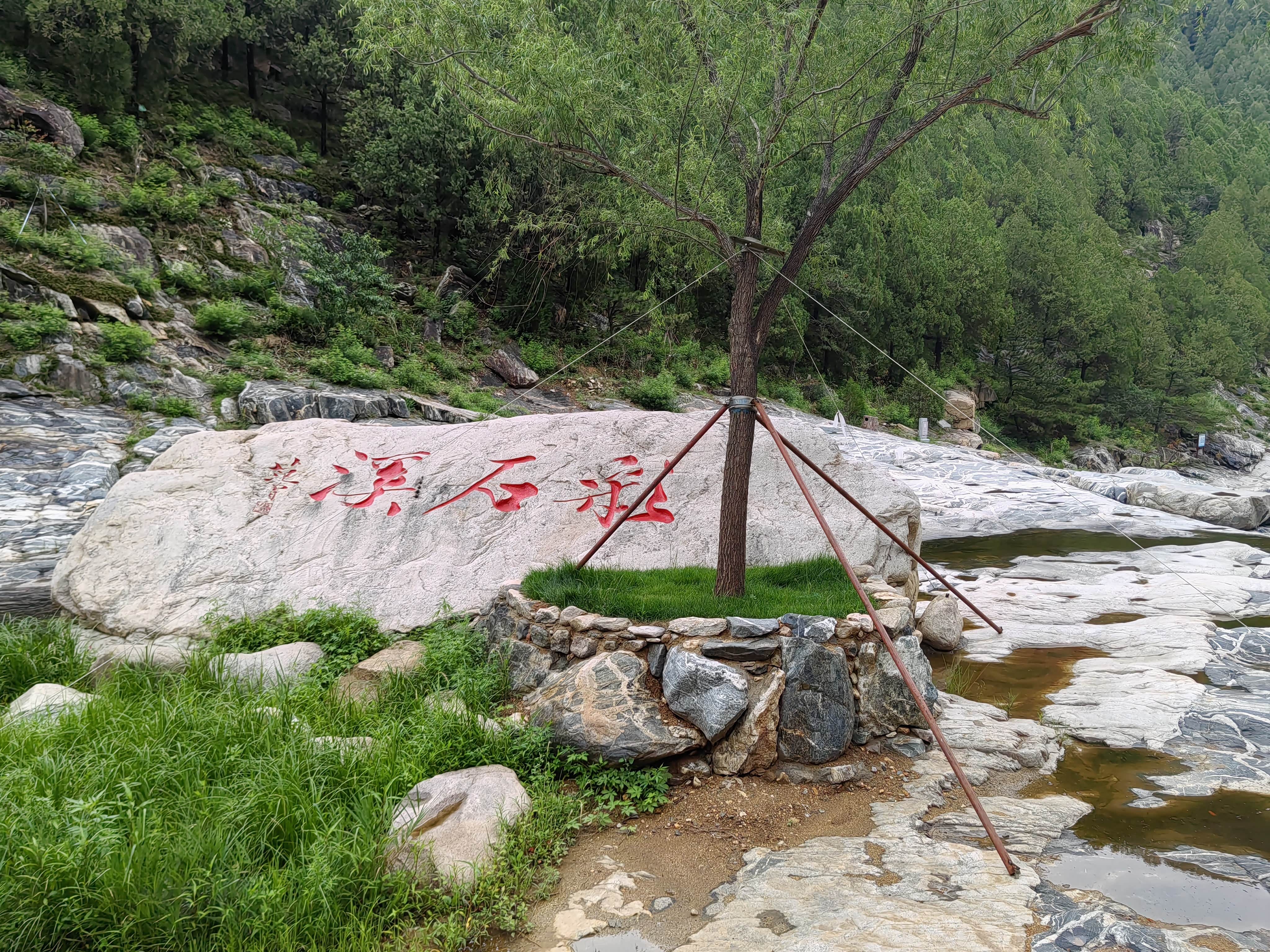 彩石溪石刻,这里是彩石溪最美的一段河床。三个大字是由著名书画艺术家范增先生题写的。
