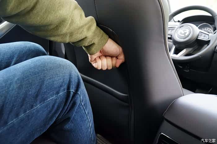 我身高174cm,开车的坐姿比较特别,喜欢坐的比较靠后,把座椅调的最低,再把坐垫前部翘起来,方向盘也要拉到最出来,此时后排还有两拳的空间。(一个人举着相机侧着拍的,看起来没那么大,角度问题)