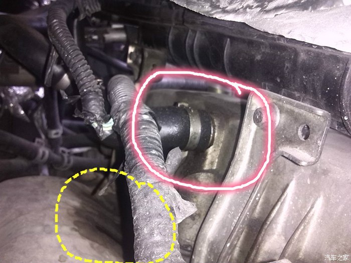借用07款发动机来说明那个位置,就是下图中红色虚线的位置,07款发动机那个管子后面是接是PCV阀,而09款那个管子后面就接了个“三通”样的T型接头,不知道那个T型接头是什么工作原理,照理说节气门前面后后面不应该用一个管子三通过去