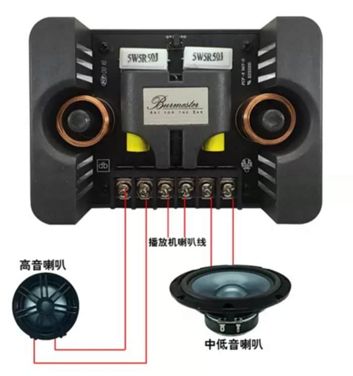 这是一个分频器,和它的接线方式,我们只用到低音部分,所以高音部分不用接,把我们的低音炮接中低音喇叭的位置,但是一定要反接(喇叭正极接分频器负极,喇叭负极接分频器正极)!输入接中间,按正常接法