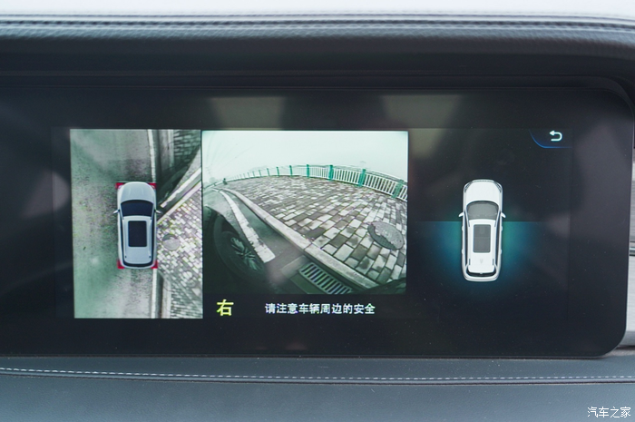 360°全景影像这个功能很好用,特别适合新手的小伙伴,不管你是倒车还是穿过狭窄路况,打开这个功能,你就不用那么手忙脚乱,离障碍物的距离,在大屏里就能看见。
