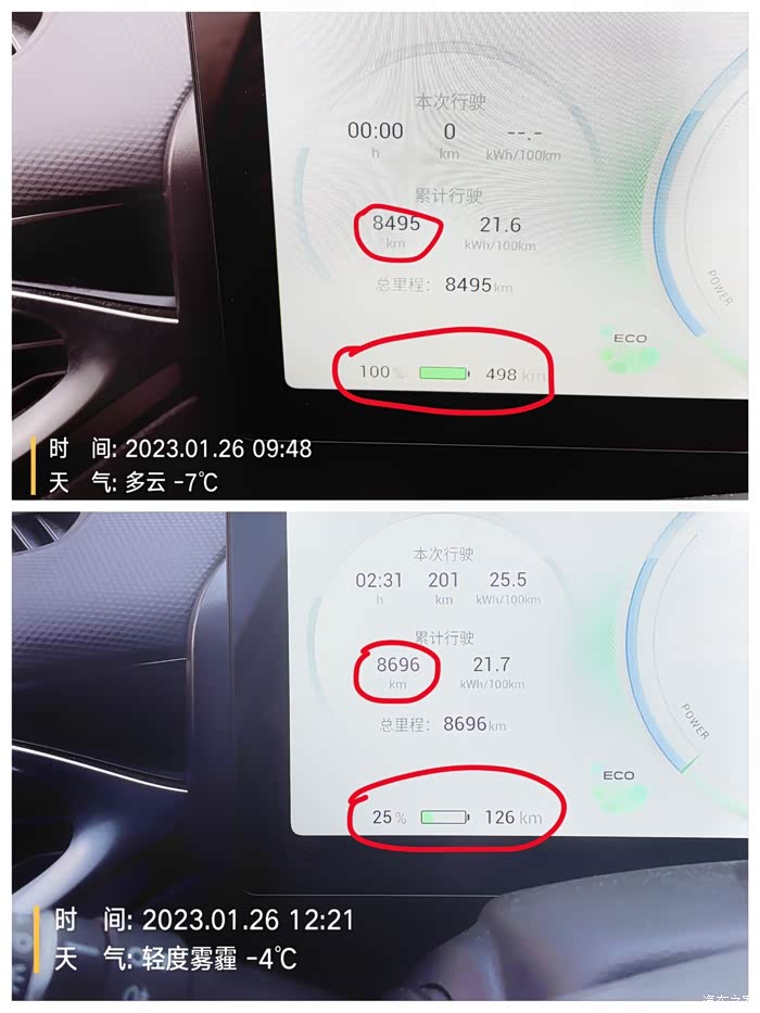 总结:室外温度-5度左右、一人、空调26度、座椅加热未开、ACC巡航105km、ECO模式、续航掉了372km(498-126)、实际行驶201km(8696-8495)、续航约打5.4折