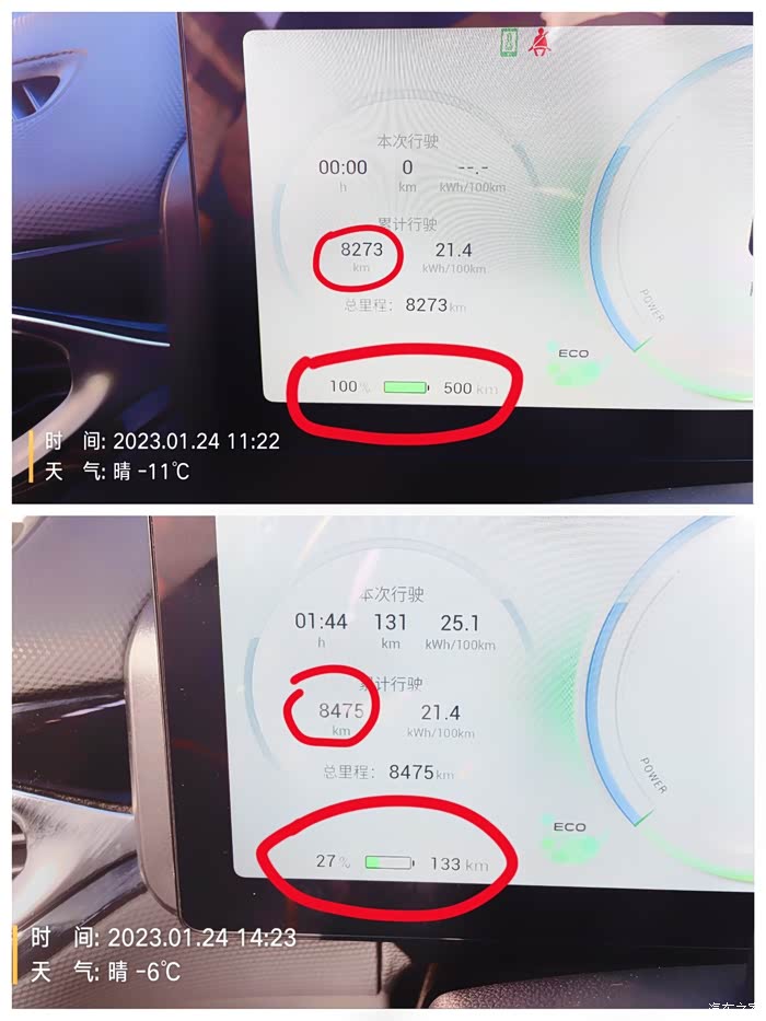 总结:室外温度-10度左右、满员、空调偶尔开、座椅加热未开、ACC巡航105km、ECO模式、续航掉了367km(500-133)、实际行驶了202km(8475-8273)、续航约打5.5折