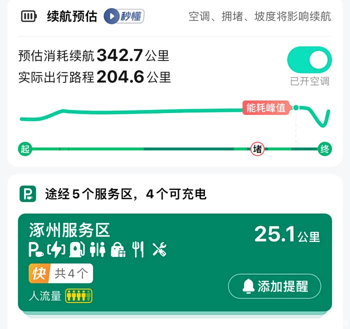返程前:气温-7度、表显续航498km、一个人、空调全程开着26度、座椅加热没开、ECO模式、ACC巡航105km