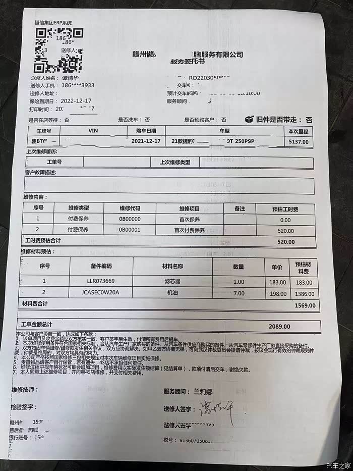 XEL小保养费用清单