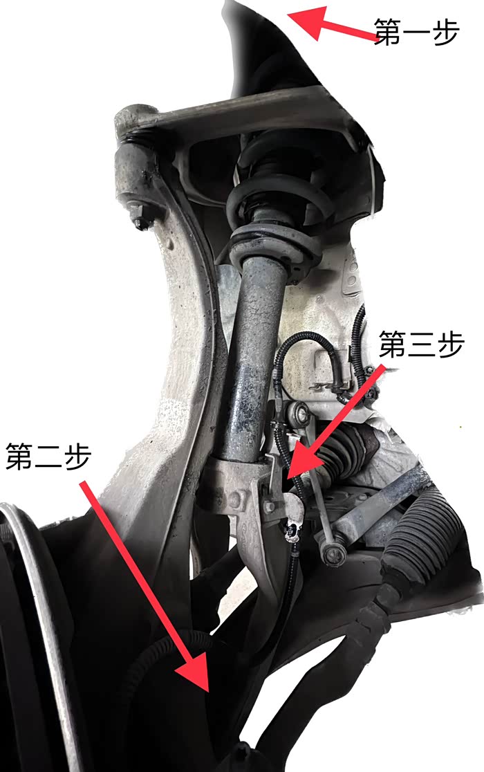 安装前避震步骤时,要以上、下、中部位螺丝上,不然行驶中回位是会出现巨大的金属扭动声音,回位后声音消失