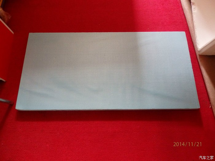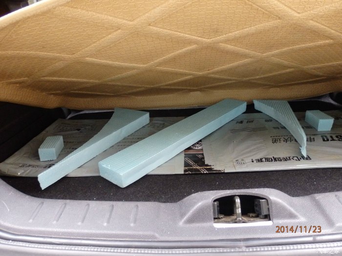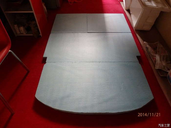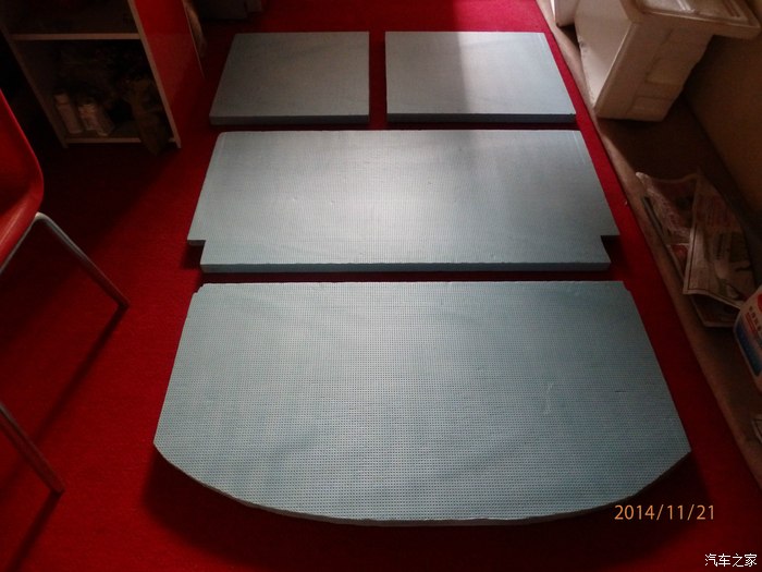 1.2m*0.6m,厚度35mm,三张正好,按照车内形状用壁纸刀裁出来,就是这样: