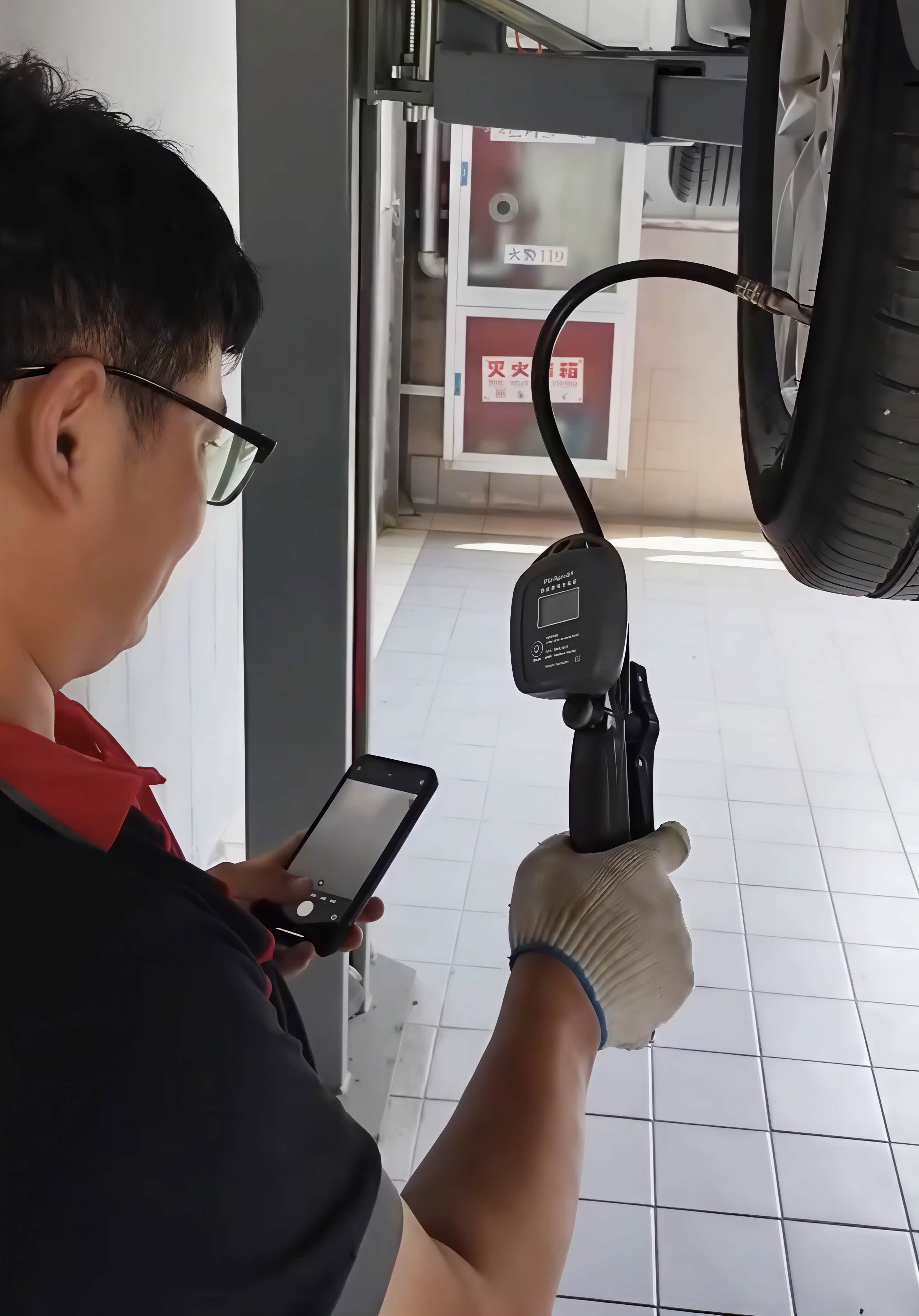 最后,师傅对四个轮胎的胎压进行了检测和调整,并仔细检查了胎纹深度和有无偏磨。我的右后轮胎纹有点浅,师傅提醒我下次保养时可以考虑更换,安全第一。
