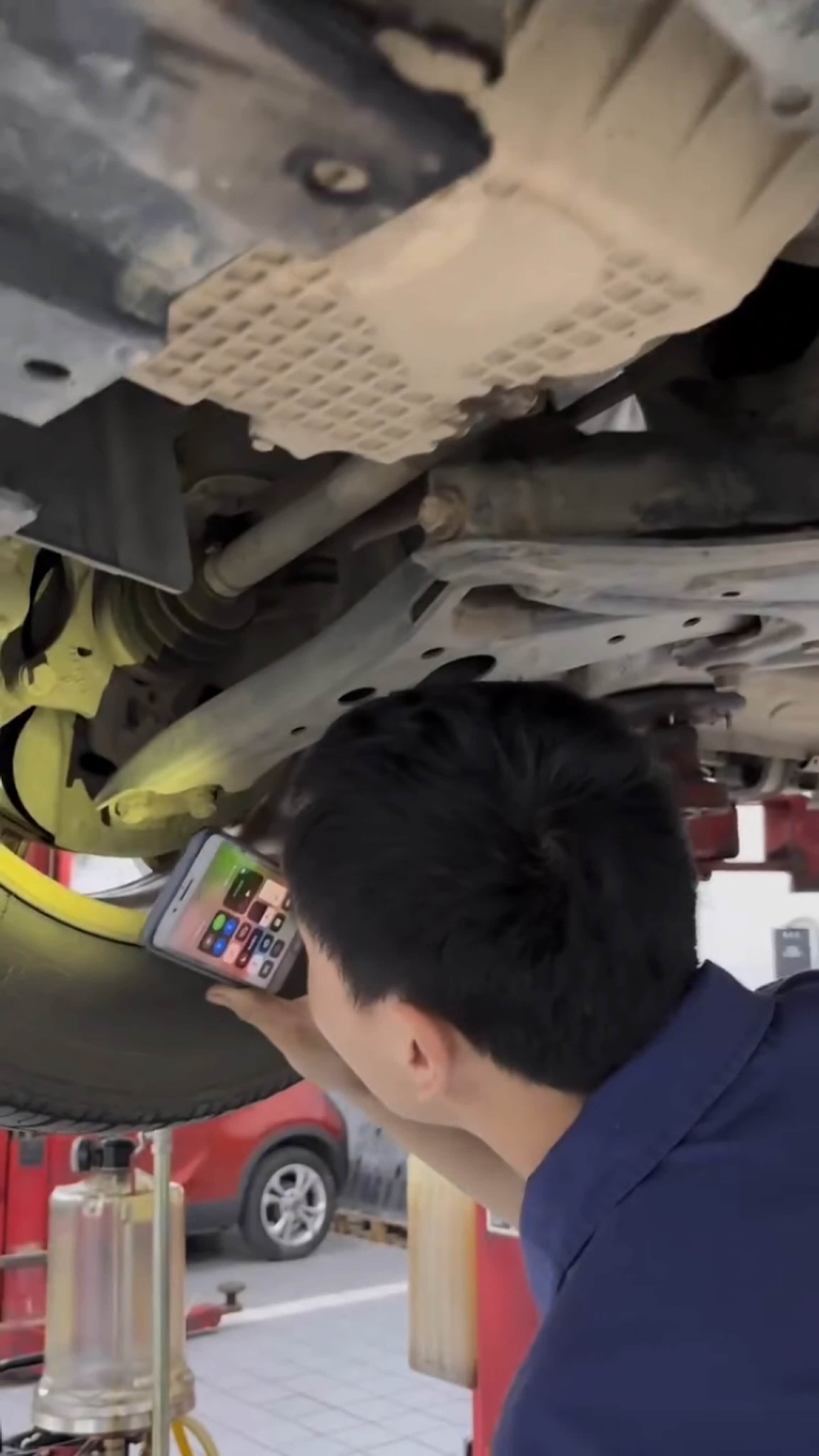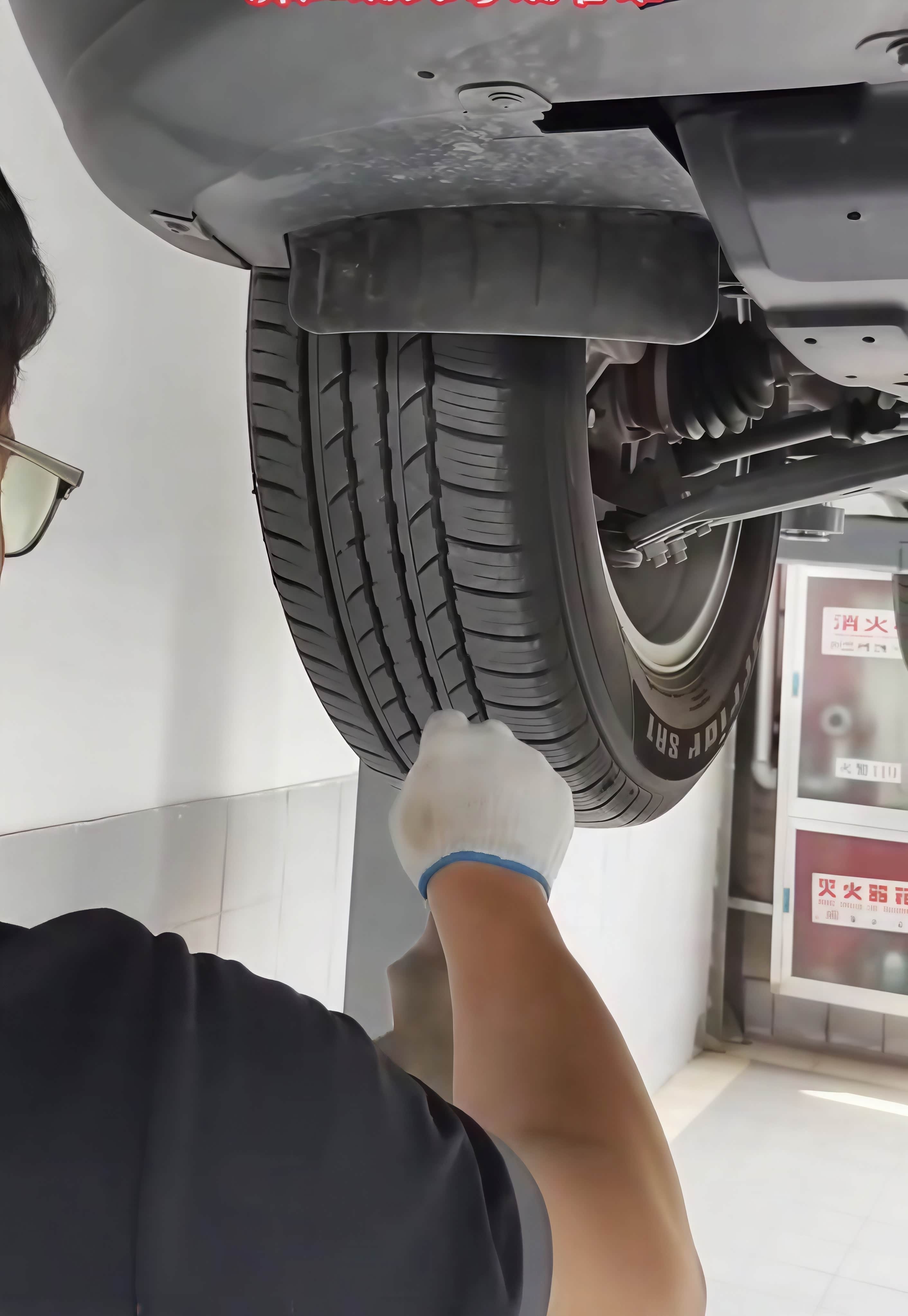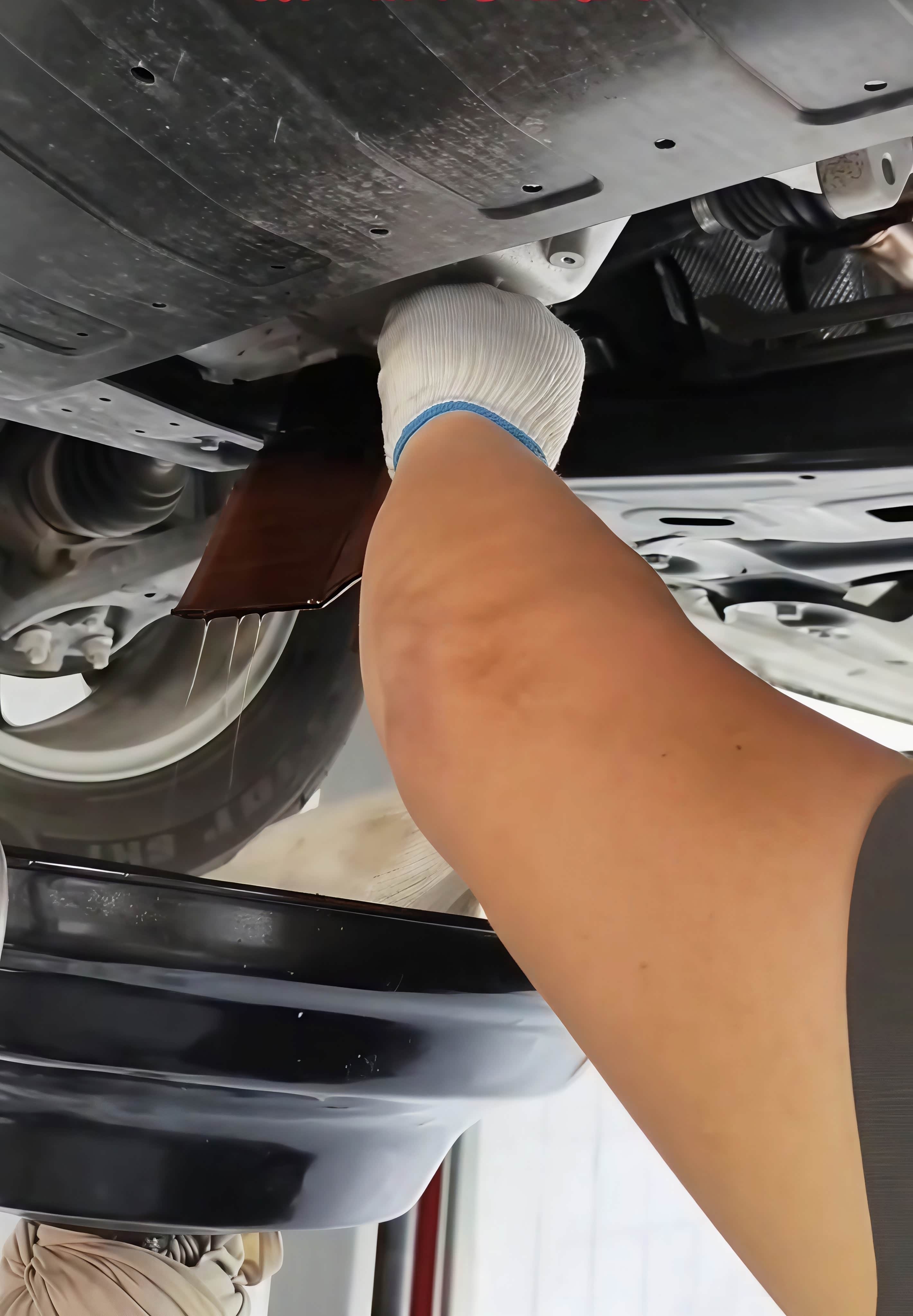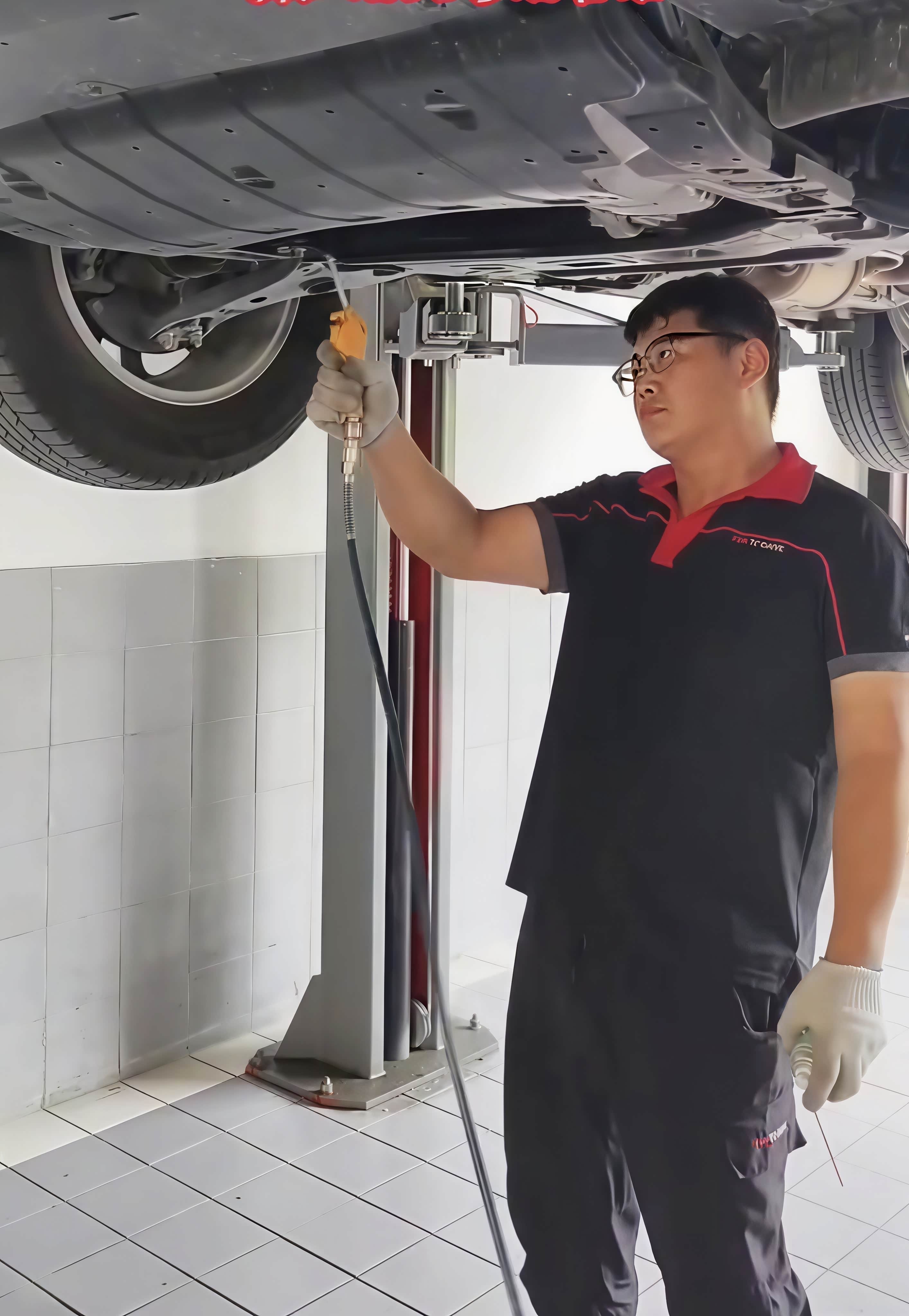 车辆被稳稳地举升机举起后,师傅首先对底盘进行了全面检查,重点查看了悬挂、减震器和排气管的状况,确认没有渗漏和松动。这一步很重要,很多潜在问题都能在底盘检查中发现。