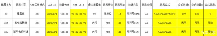 图中蓝线框出的就是我自己增加的自定义数据,其他数据是仪表本身自带打包好的数据。从上往下,从左往右的顺序依次为:发动机转速、发电机转速、水温、车速、驱动电机转速、小电池电压、发动机爆震值、引擎负载、燃油剩余量。