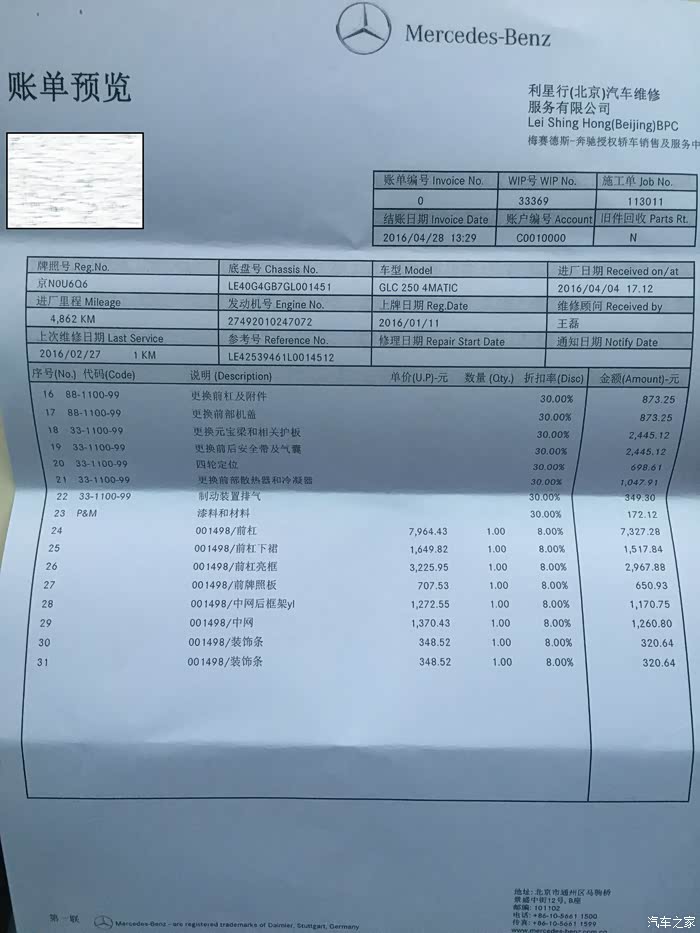 第二天一早过去办理手续,然后各种走流程,一周左右得知定损金额16W多,这是修完车后4S给我的详单: