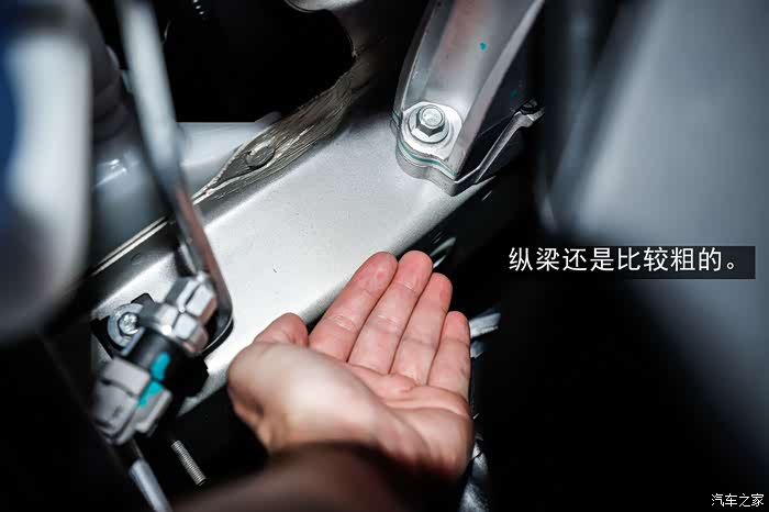 前防撞梁没法拍到,但是可以现场看见是铝合金件,而后防撞梁则是单层冲压件。属于比较常见的类型。