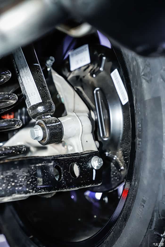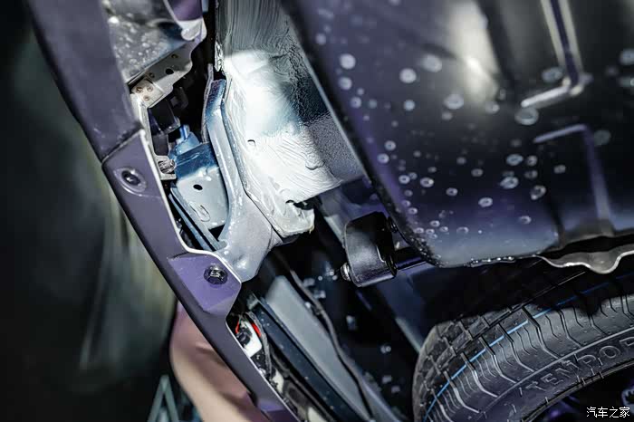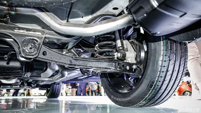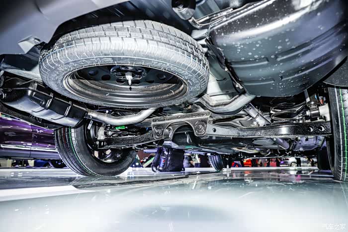 虽然都是同一个平台,但是悬挂的拉杆等零部件是不一样的。后副车架采用钢管架焊接,提高轻量化,降低车身重量。备胎因为7座的原因而采用了外挂形式,这也是很多7座车不得不面对的空间取舍。