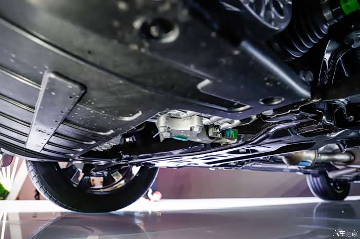 车展最可惜的就是没能把车子抬起来,不然可以给大家拍摄的清楚一些了。来自于T1X平台的第三款奇瑞车型,全新一代瑞虎8跟之前的瑞虎7以及瑞虎5X结构上属于大同小异,都是采用了前麦弗逊后多连杆的设计。上图为发动机舱下方,副车架采用全框式结构。原厂没有完全密封的塑料护板,后期可以加装一块。