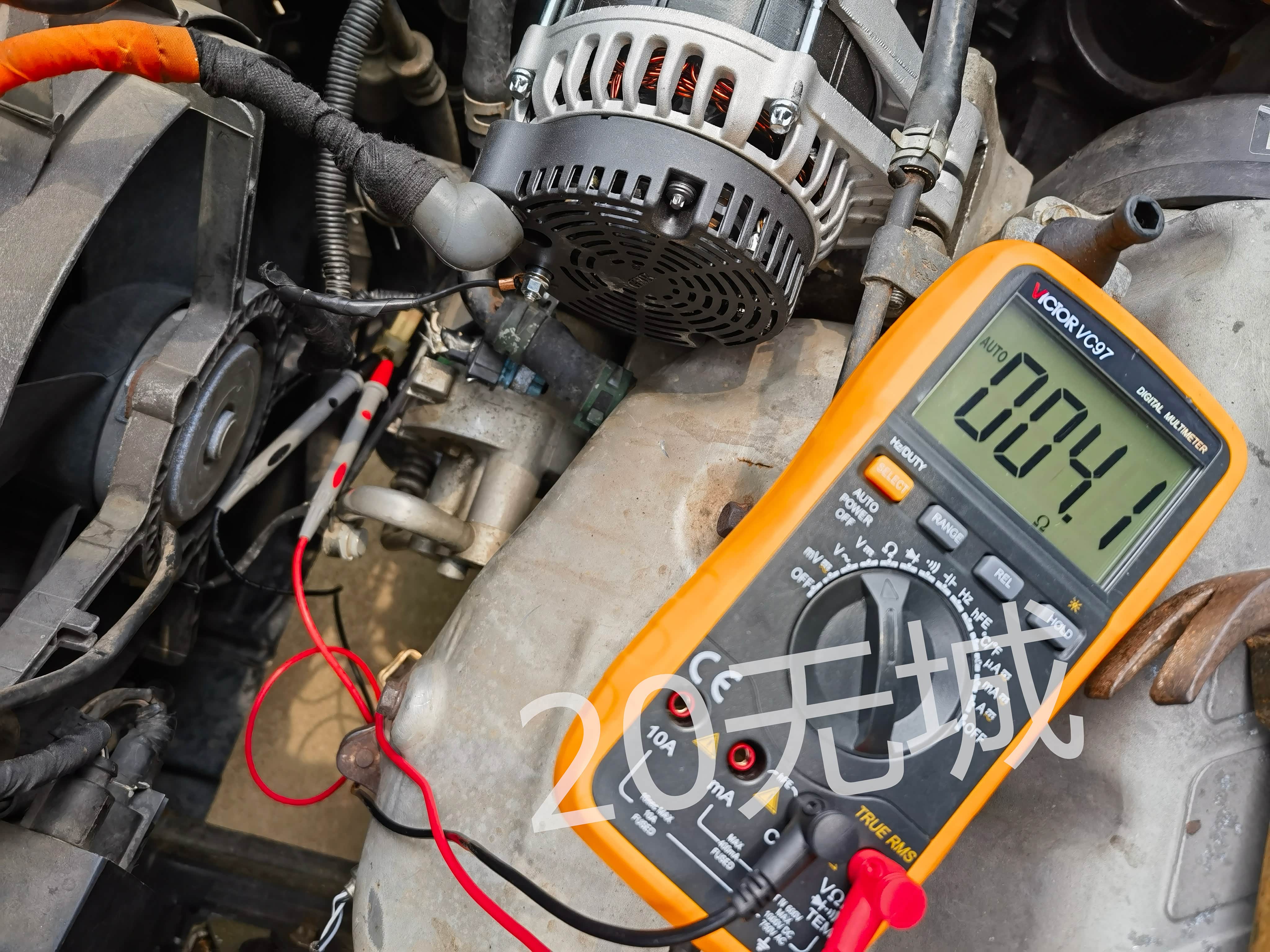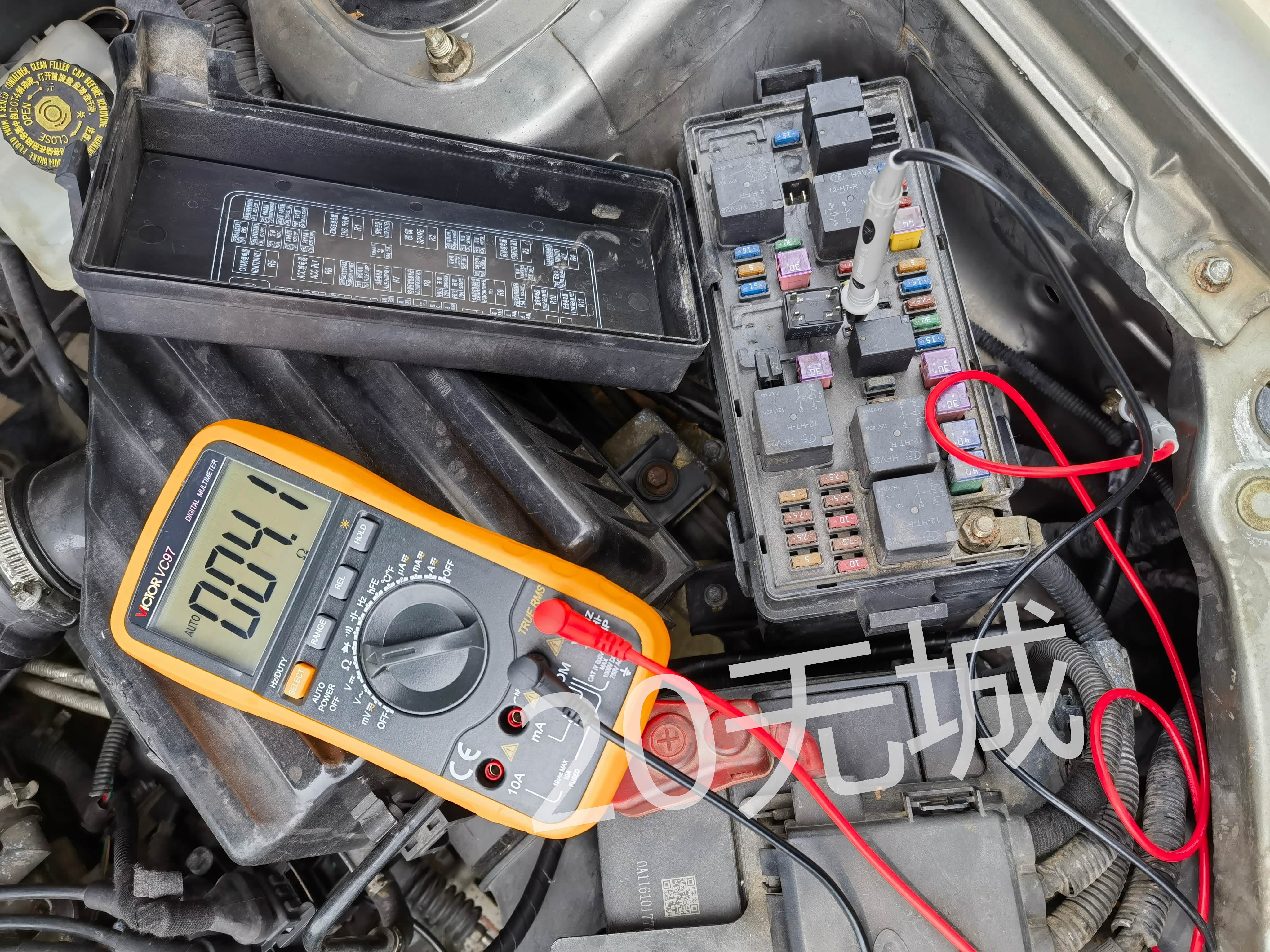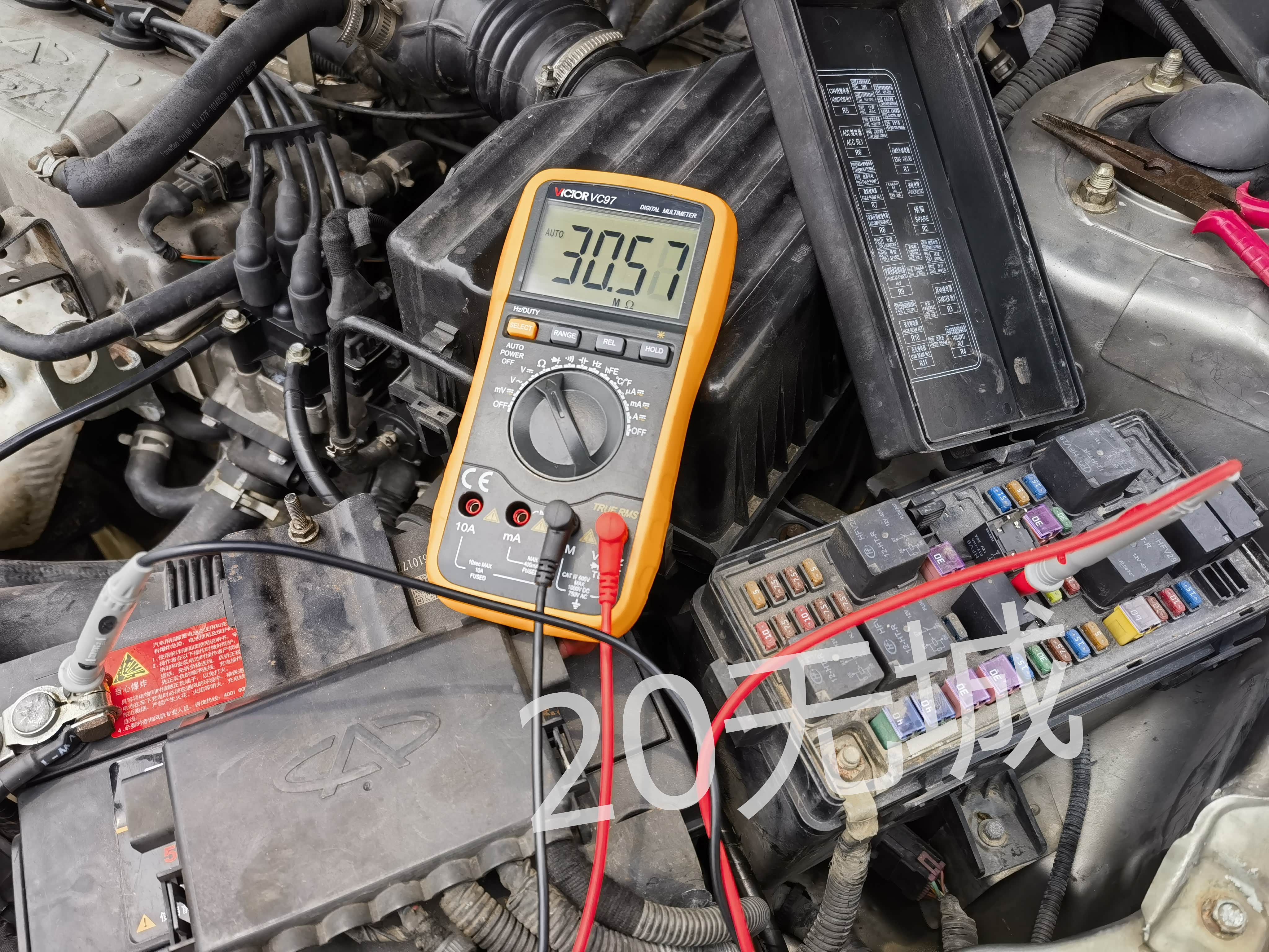 万用表电阻档测量电磁离合器线圈继电器输出脚“87”与地之间的电阻,为30多M欧姆,明显回路不通;