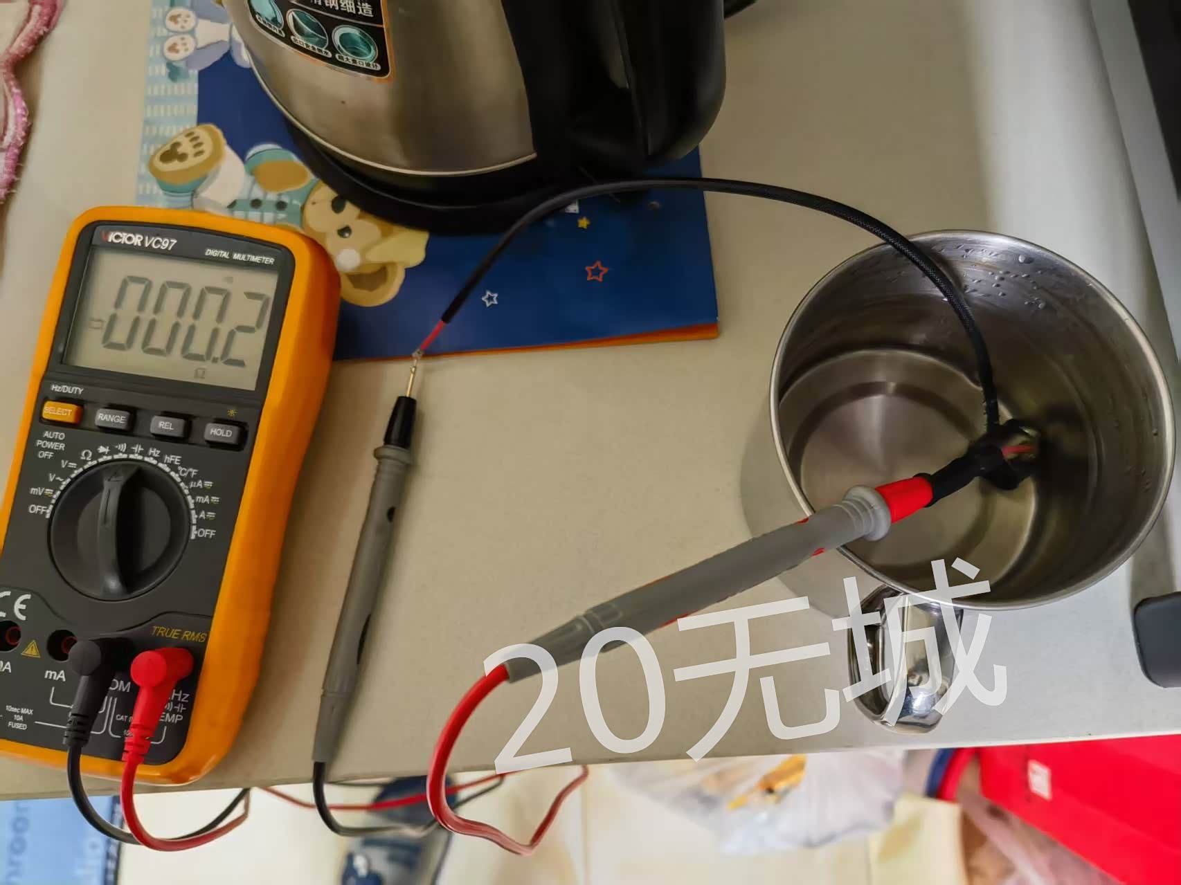 经过开水实验,热保护器100摄氏度也不会跳开,两线之间电阻很小,排除万用表表笔自身电阻,触点电接近零
