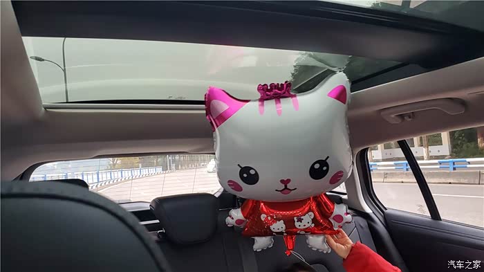 出门玩一趟手里是一定要拿玩具的,小猫咪气球安排上,小朋友一有玩具开心得很,安安心心的坐在车里。