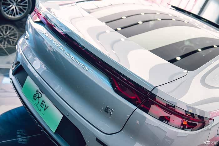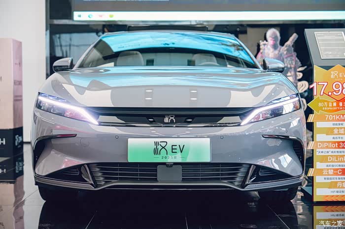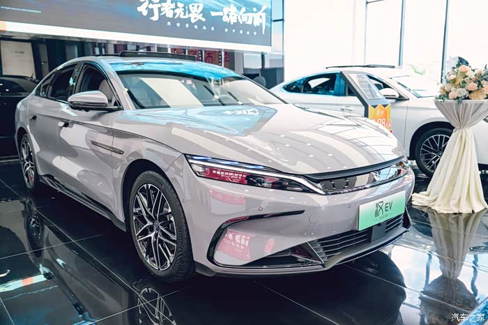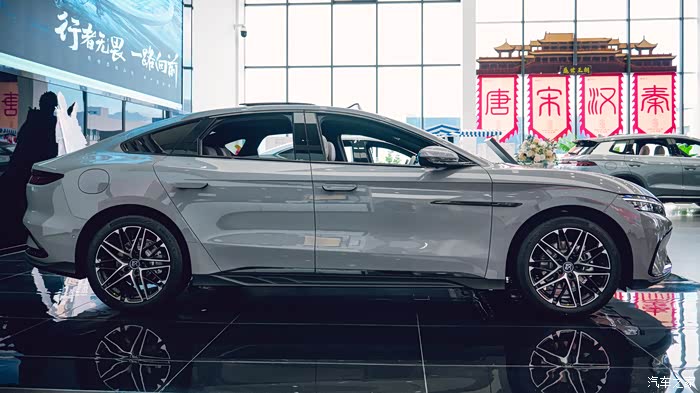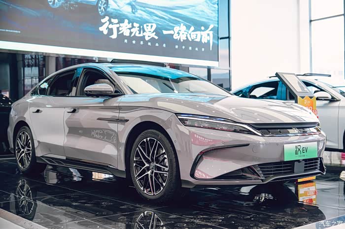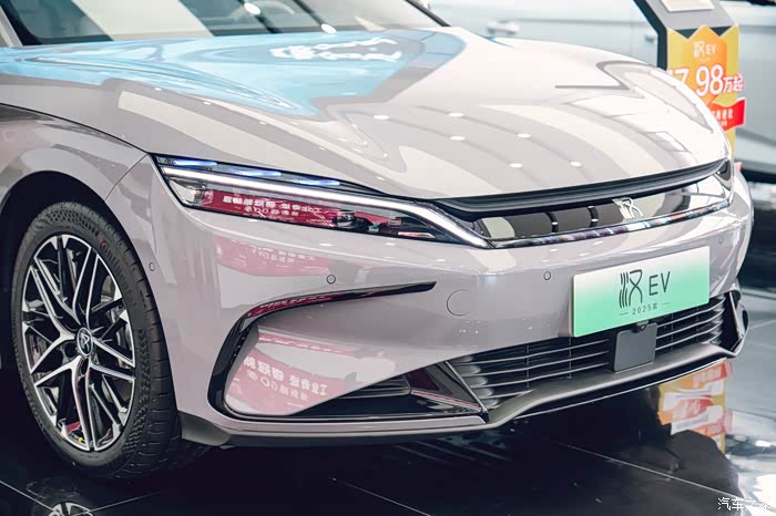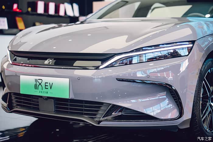 那我们还是先从外观说起,咱这 2025 款汉 EV 一眼看过去,还是熟悉的家族味道。但是,又有不少让人惊喜的小变化。那个新增的这个“未央灰”配色简直绝了,在灯光下显得特有质感,高级感一下子就上来了,感觉更加沉稳大气。