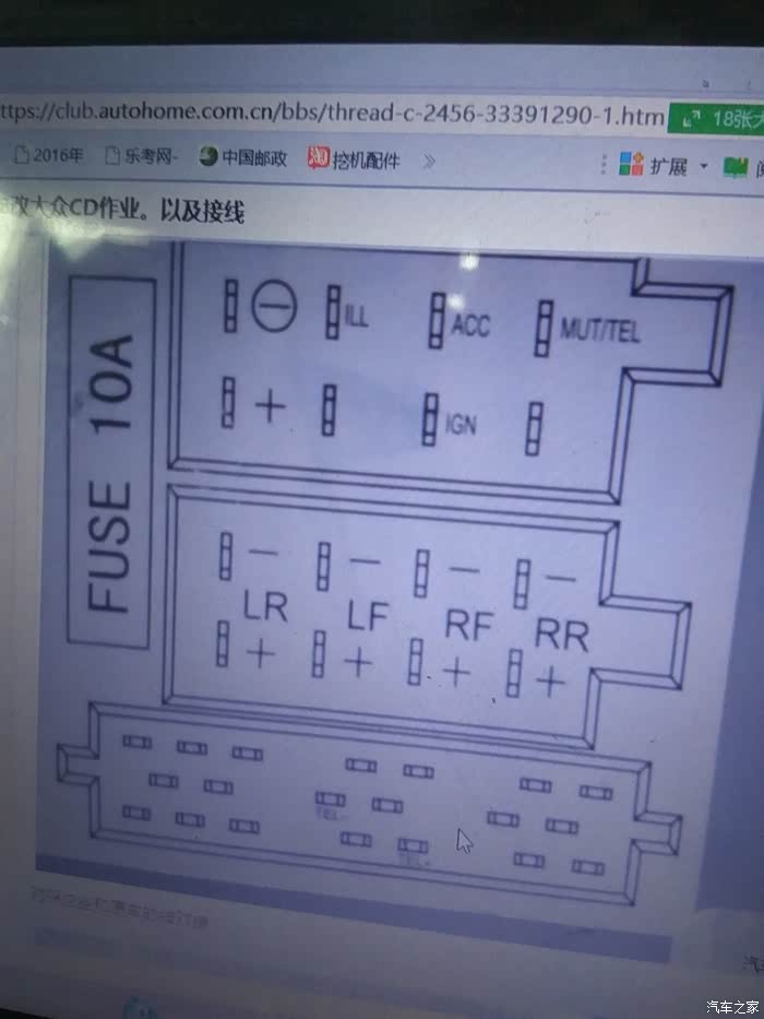 这张图片就可以指导我们正常接线,其实只有四根,我还有一根接大灯的线没接,所以导致开大灯,CD安键没灯光,过几天换喇叭的时候再把那根线接上。