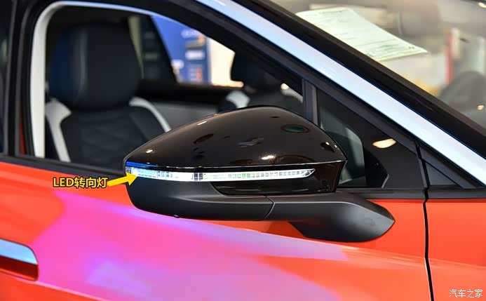 后视镜集成LED转向灯,以及侧面摄像头,黑色的后视镜与车身反差很大突出视觉感受