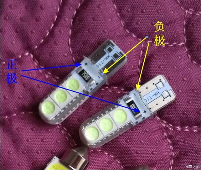 T10的led小灯泡是分正负极的,装车时要先试通电,能点亮就证明正负极装对了,正负极不对是点不亮的,把LED正负极换一个方向就可以正常点亮了。