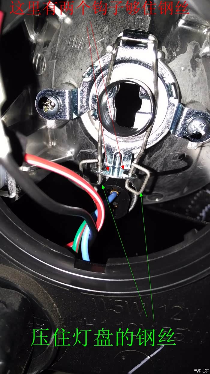 这连根钢丝可以从钩子里取出来,取出来就能把原来的灯泡取下来,再把LED的灯盘固定上去。