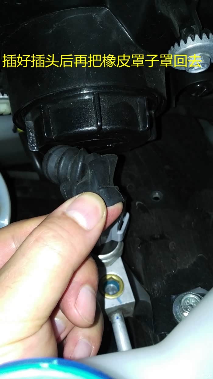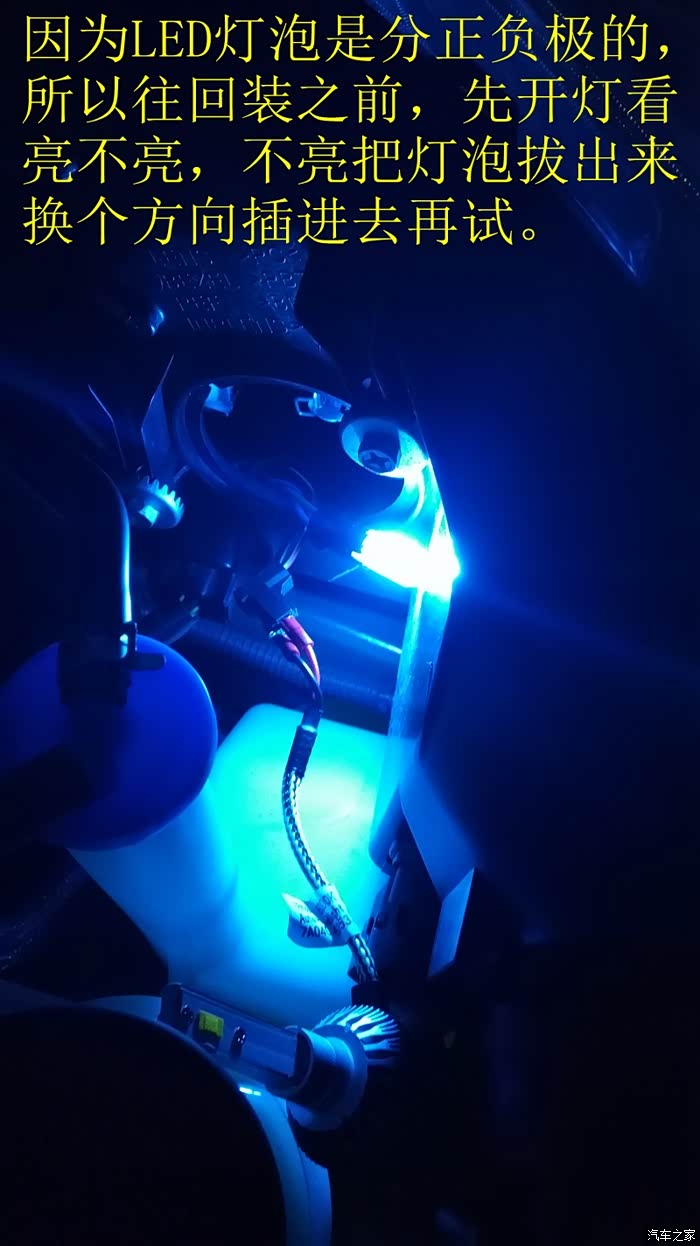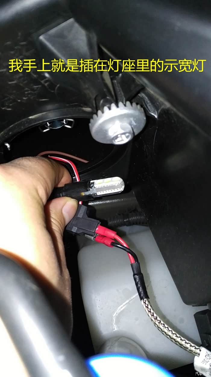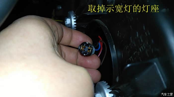 灯座拔出来后,拔掉灯座上原来的卤素灯,插上LED示宽灯,LED的示宽灯是分正负极的,所以先别往回插灯座,先通电看灯亮不亮,不亮换个方向重新插进去再试。正常点亮后就可以把示宽灯的灯座插回到大灯里去,插回去就可以用手的,一个指头就按进去了,有卡塔一下卡住了的手感。