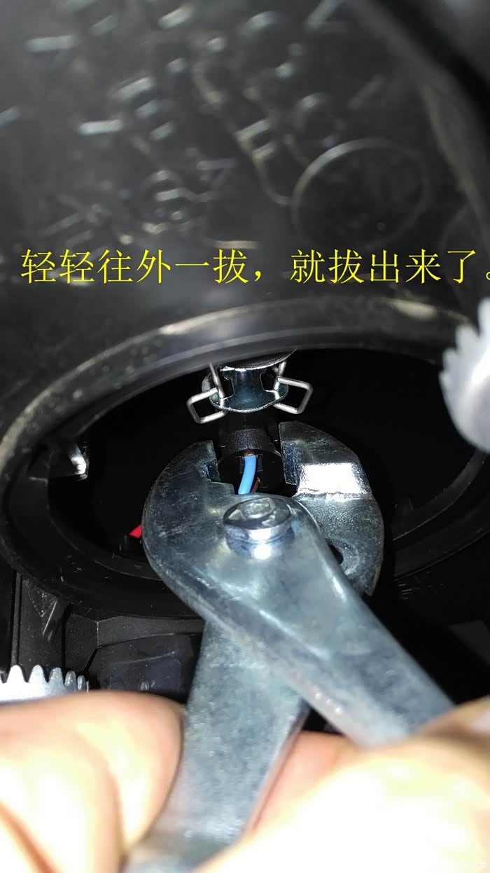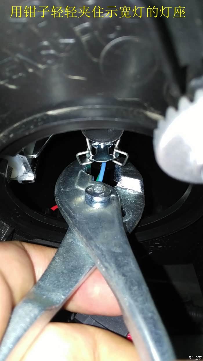 但看到并不等于可以拆出来,一开始也不知道是拧下来还是拔下来,手能摸到,但没法用大拇指和任意一根其他指头捏住它,左试右试,实在没法像拆装远近光灯那样用手就搞定,只能拿来随车工具中的那把鲤鱼钳,开到钳口较宽的那一档,夹住示宽灯灯座后先旋转了一下,没什么感觉,然后试着往外拔,轻轻就拔出来了。