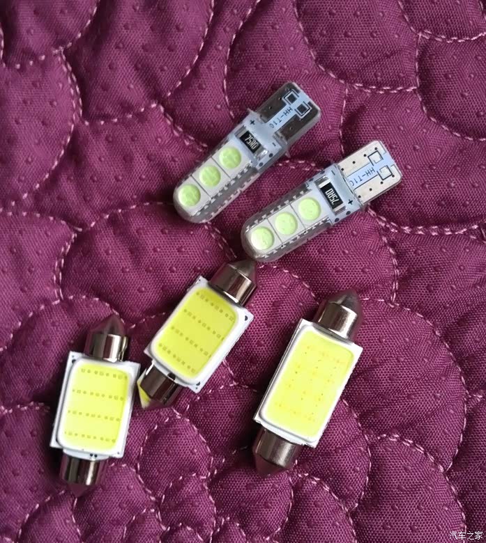 两颗T10,三颗双尖,两颗36mm的双尖换中顶灯和尾箱顶灯,一颗39mm的双尖换前顶灯。