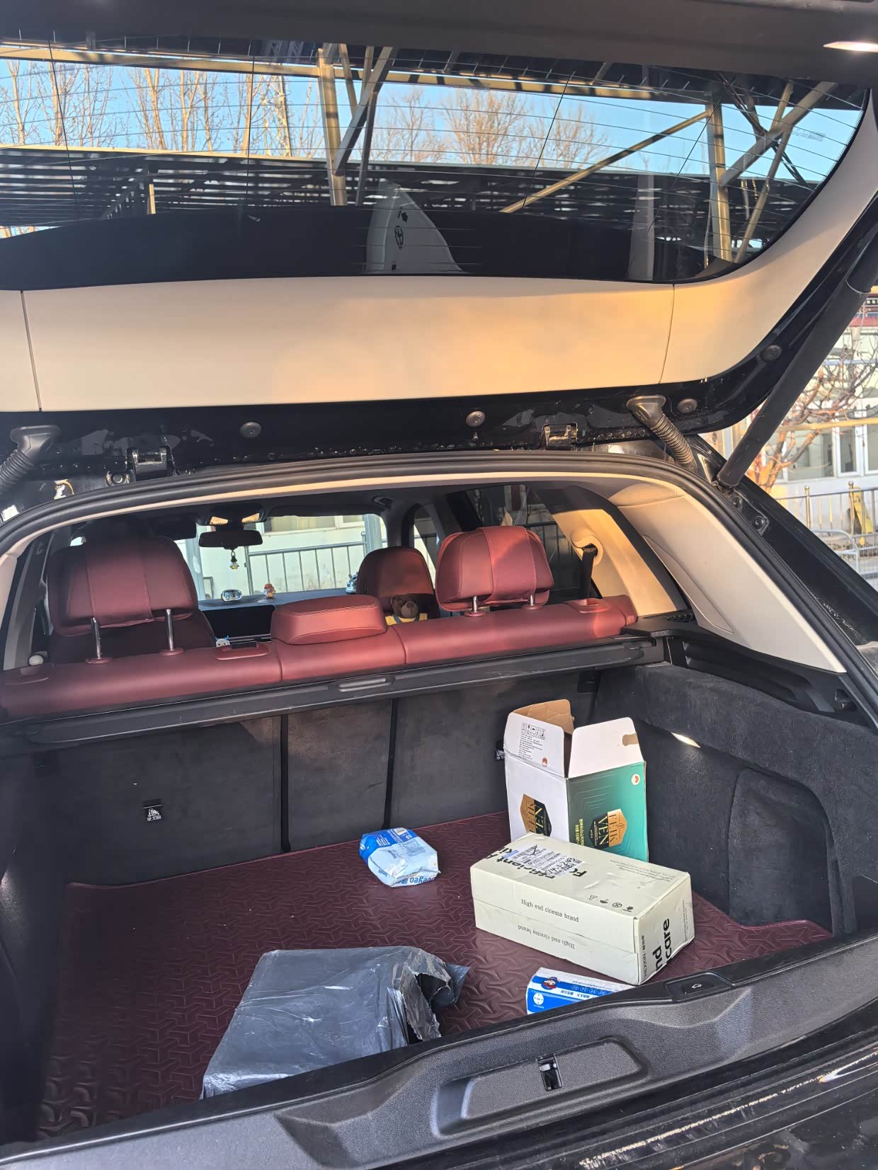姥姥给装了、一箱苹果,哈哈哈 还有一箱面膜 我服了 后备箱随便一塞还有大半空