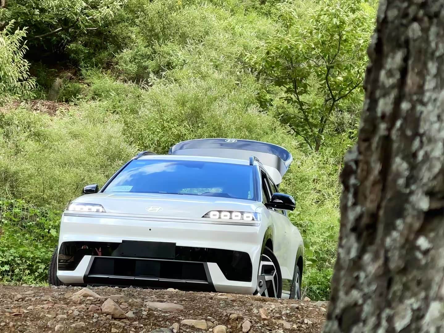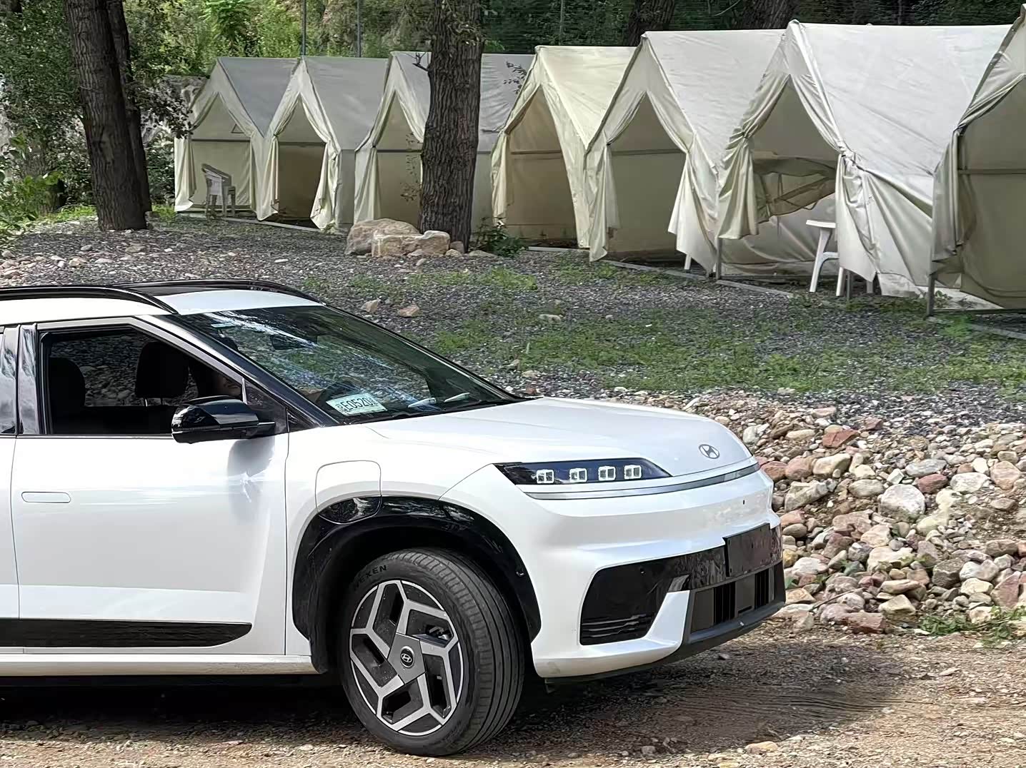 活动当天多台ELEXIO一同前往密云区的一处露营地,路上经过了柏油路,高速路,非铺装路面,包括一段涉水路面。我负责驾驶的白色elexio 格外耀眼,四眼大灯像极了布加迪的前大灯。跟随队伍进山的过程中,通过电机带动,同车的四个人均表示动力相当不错,加速和刹车感觉都很线性,相较于开过的其他电车,更接近油车的驾驶感觉。