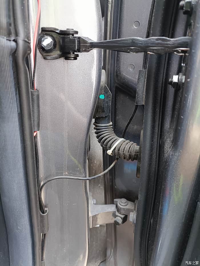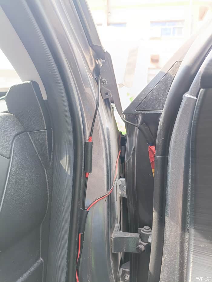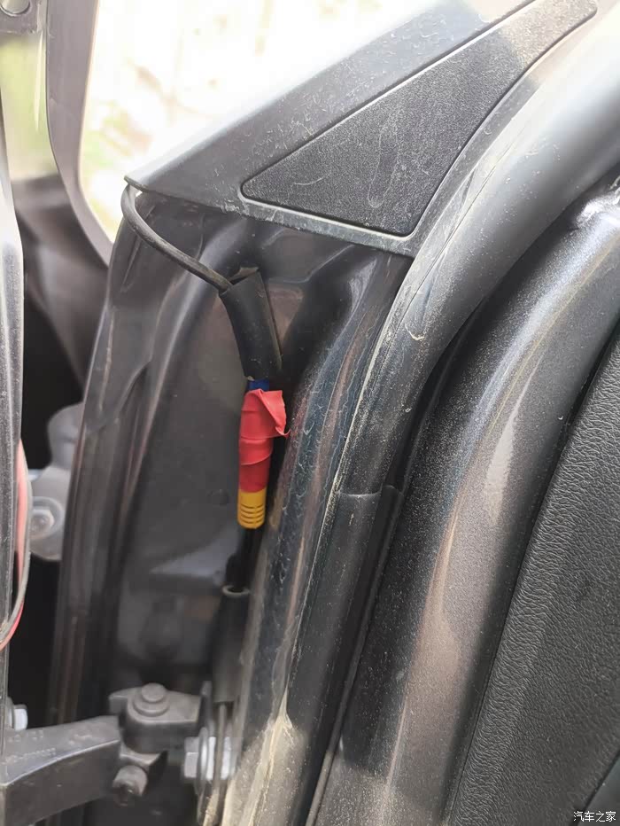 接着是布线。朋友打开车门,沿着车门边框的缝隙,巧妙地将摄像头的线隐藏其中,一直延伸到车内。然后在驾驶舱内,将线穿过中控台下方,连接到显示屏上。这期间,不断地用胶带和线卡固定线材,确保线路整齐且不会干扰其他部件。也怕关门碰到线了,