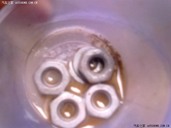 分析可能是汽油滤,喷油嘴,以及三元催化和氧传感器引起的。。所以一并清洗包括火花塞!空气滤刚换节气门和怠速马达洗过不久所以就不怀疑了。看以前论坛前悲是用草酸与水按一定比例清洗的!但一时心急加之明天比较空,决定用洁厕液代替草酸!据说洁厕液含有百分之十左右的草酸或盐酸,是据说哦!晚上去弄了六瓶,六百ML一瓶,结果4瓶就够了!当晚不知道这个清洗效果怎么样!就找了几个锈迹斑斑17MM的螺丝试下