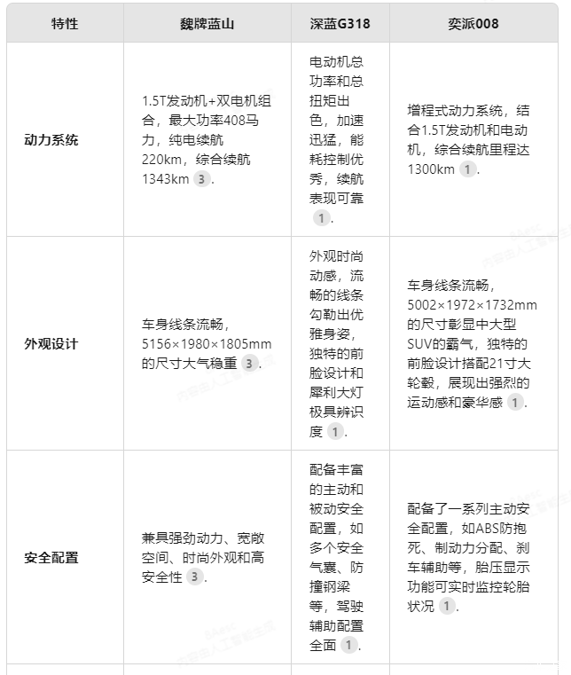 话不多说,参考了搜集来的各项信息,进行了几个方面的比对,魏派蓝山、深蓝 G318 和奕派 008 三款车各有特点,以下是它们的对比:
