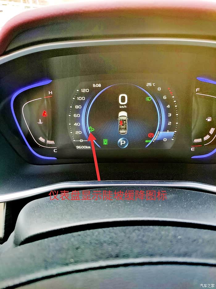开启后仪表盘有显示待车速达到4——35km/h时缓降功能介入
