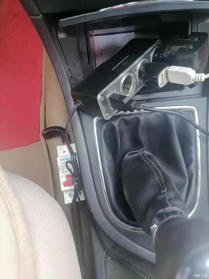 走线到驾驶座,连接到100A直流空开。没有使用所谓自动隔离器。空开用螺丝固定在变速杆箱上。平时空开断开。需要充电时合上。驻车时断开。确保任何时候不使用汽车电瓶的电,确保副电瓶不与汽车电瓶同时充电。