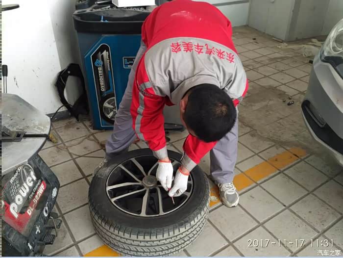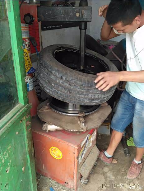 保养完了,小师傅给我把这个轮子压力打到3个,让我去路边找个补胎店去修补。我开上车去路边店补了胎。