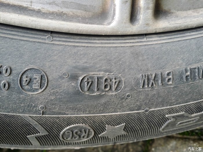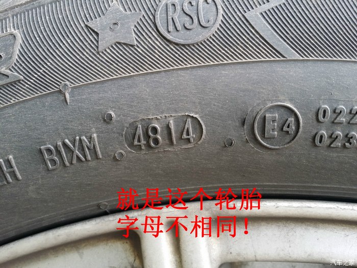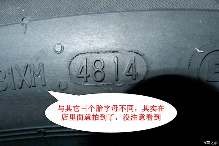 4S店贵的厉害,正好单位边上有个途Hu可货到付款的轮胎店,于是下单,到货后就大概看了下轮胎日期,店里面光线很暗,随便拍了几张照片即喊师傅换胎,车子跑一些日子后,又在室外拍了轮胎的几张照片,回家一处理,竟然发现有一个轮胎英文字母跟其它三个不一样,我把图片发下面,请各位师傅内行们指教,先谢了!