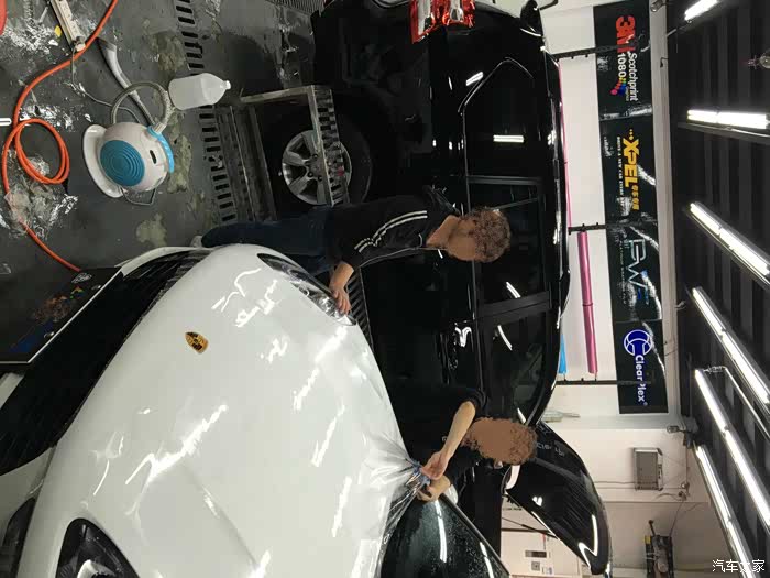 施工的过程。MACAN车主说,我宁可用X元贴一个引擎盖的保护膜,也不愿意用这钱来重新喷油漆,原厂的油漆是最好的。深感同意,不然我也不会败家到这种程度来贴。