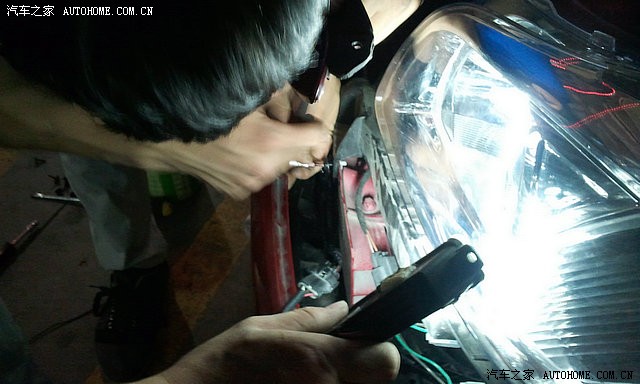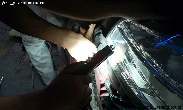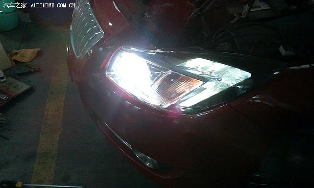 e、拆完原灯之后,安装旗舰大灯,由于环境太暗,拍出来效果太亮,其实现场看很漂亮(在黑暗的环境中,侧看大灯,两条光柱,好看),真的。