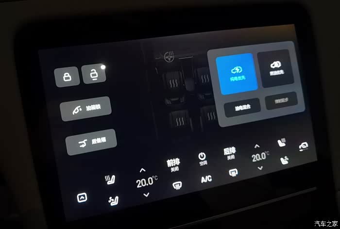 这是空调面板,可以控制前排的座椅加热通风,后排的座椅加热,前后排的独立空调,包括汽车的油电切换,还有个就是方向盘加热,冬日暖阳啊。都是标配,不用花钱选。