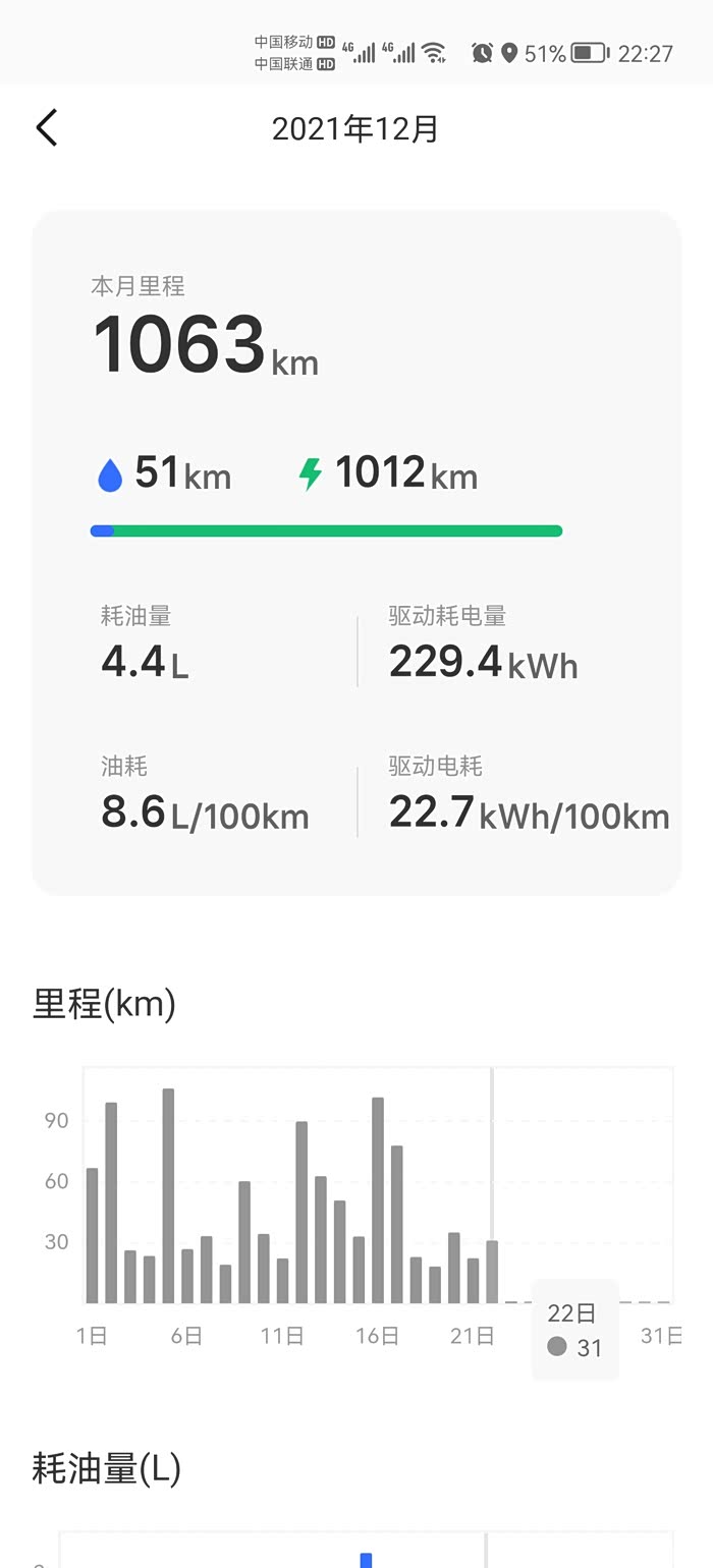 后面说说买这车的理由,当时也是处于好奇心,然后就是听说,这家伙能体验到电车的节能,也不用担心里程焦虑配置各方面也不错,空间也还可以,也算盲目入手了吧。使用一年以后确实没啥小毛病,按时保养,价格也不贵。因为上班到家,一天也就30公里左右,也免费配了个充电桩,市区通勤,几乎不出远门是用不到油的。一个月的电费也就是200左右,平均下来,一个月的用电量也在1500公里左右,纯电确实成本就低了。