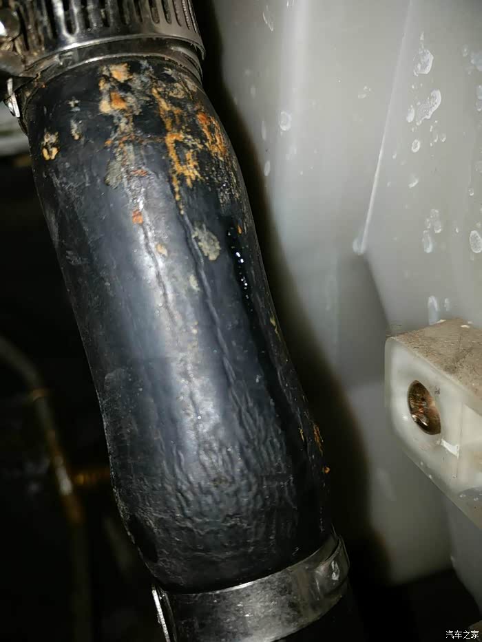最近副水壶总是缺防冻液,在副水箱加了三回防冻液了,还是少!拿手电照照水泵处,也没见漏。以前知道暖风小水箱接管处渗水,但是不大,所以没在意。昨天买了4个不锈钢卡子,想加个卡子紧一下。买来后就趴主驾下面把卡子套上了,用手一摸还真都是水!心理想这回找到根源了,然后都紧上了,紧完了还滴答水,比之前滴答的还快了!这是怎么回事呢?用手电照一下吧,我的天呀!水管老化有裂口了!于是赶紧淘宝看看有没有卖的,问了好几家都没有卖的,只有和小暖风水箱一块的总成!一个胶管坏,我也不能买个总成吧!于是想,那头是和机器通着的,应该和暖风水管一样粗细的。因为昨天限号,车不能动!今天一早,开车去汽配城,买了颗暖风水管,在店里跟小水箱总成上的连接管比了一下,一样粗细,这下心理有底了,开车回家准备换。车停好,但是,水箱里很热估计压力也不小。先晾晾,等温度下来再拆。有防冻液总少,找不到漏点情况的,不妨看看这!